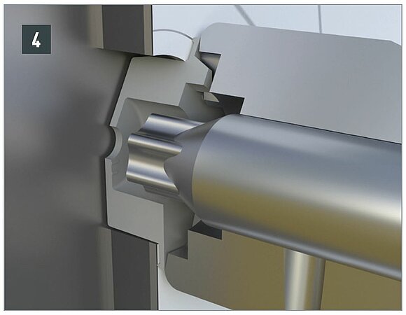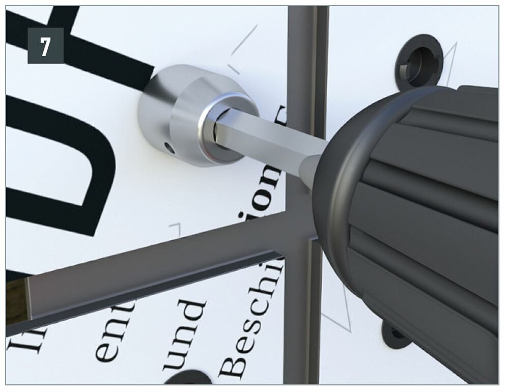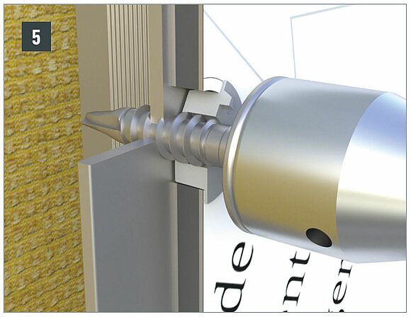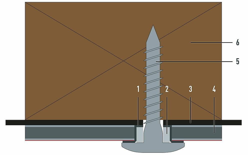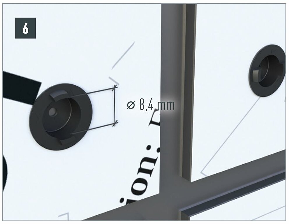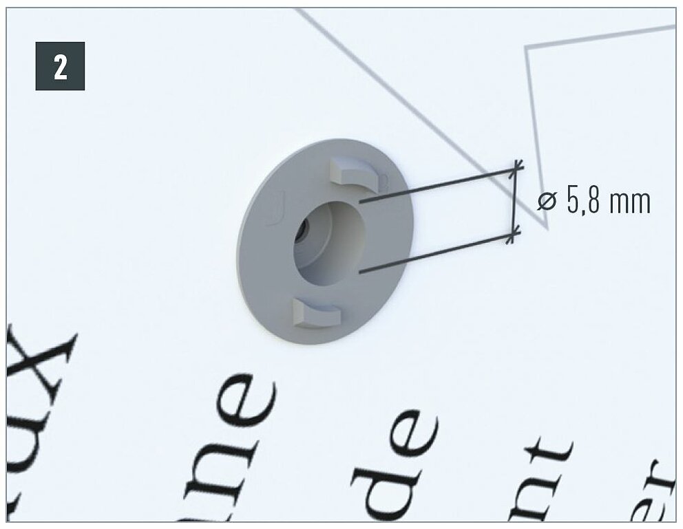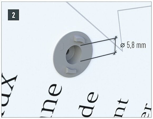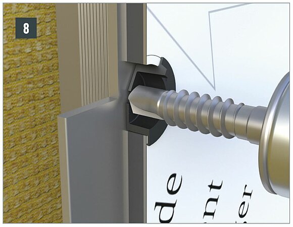 Eftersom PREFABOND aluminiumkompositskiva är fast förankrad med underkonstruktionen i trä vid denna punkt förhindras en förskjutning av plattan med en fast punkt. Tryck ner fästhylsan i borrhålet från ⌀ 8,5 mm till ⌀ 5,1 mm för att skapa en fast punkt. I nästkommande steg kan sedan skruven skruvas i.