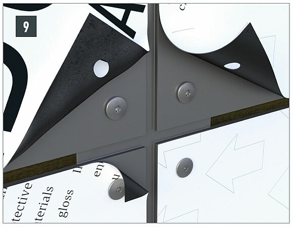 Rispa skyddsfolien runt borrhålet lätt med PREFA-folieskäraren (⌀ 9,5 mm) för att göra skyddsfolien lätt att avlägsna efter avslutad montering. Folien kan annars klämmas fast mellan plattan och undersidan av skruvhuvudet, vilket försvårar avlägsnande.