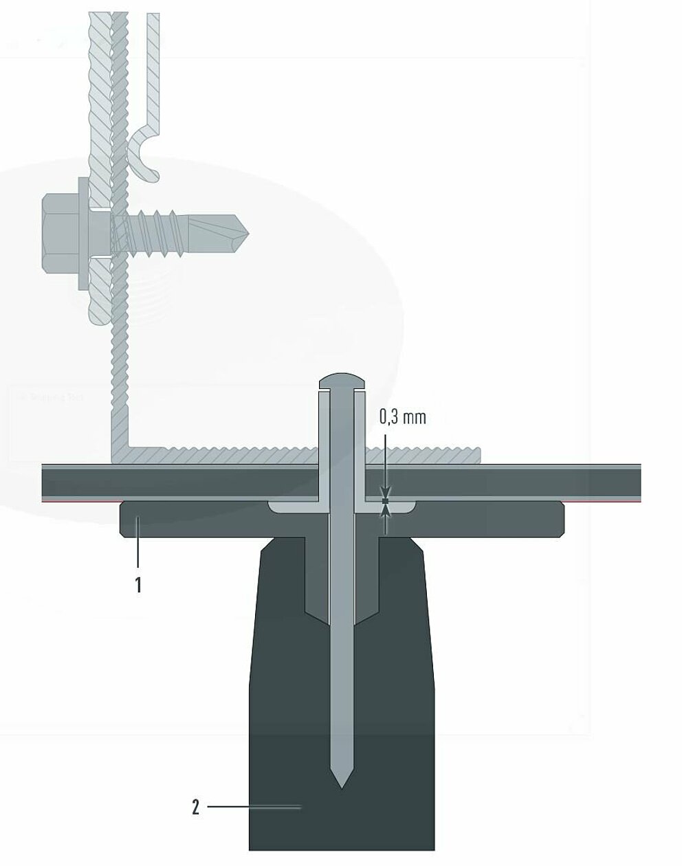 Rispa skyddsfolien runt borrhålet lätt med PREFA-folieskäraren (⌀ 5,1 mm och ⌀ 9,5 mm) för att göra skyddsfolien lätt att avlägsna efter avslutad montering. Folien kan annars klämmas fast mellan plattan och undersidan av nithuvudet, vilket försvårar avlägsnande.