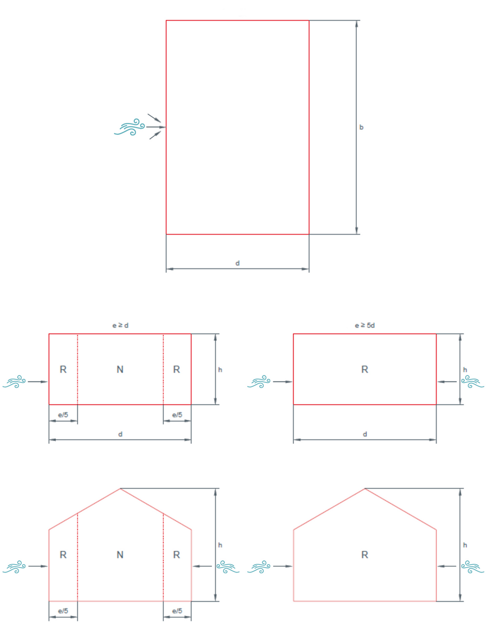 Vid montering av inklädnader med stående fals ska skivbredderna och fästavstånden anpassas efter den objekt- och platsberoende vindbelastningen. PREFA har tagit fram förenklade dimensioneringar för montörer som presenteras tabellform. De förenklade dimensioneringarna gäller enbart för stängda byggnadskroppar och bara för PREFALZ eller FALZONAL® i kombination med klamrar och glidklamrar från PREFA och tillhörande fästdon (spikar/skruvar) från PREFA samt vid montering på hel panel. Tabellerna har upprättats med utgångspunkt i EN 1991-1-4. Terrängtyperna gäller enligt EN 1991-1-4 och referenshastigheten enligt nationella tillägg till EN 1991-1-4. Fasadzonerna har optimerats till två områden och döpts om (R=randzon, N=normalzon). Vid byggnadens randzoner är vindlasterna som störst och kräver extra åtgärder.