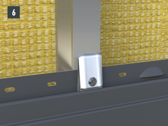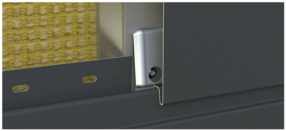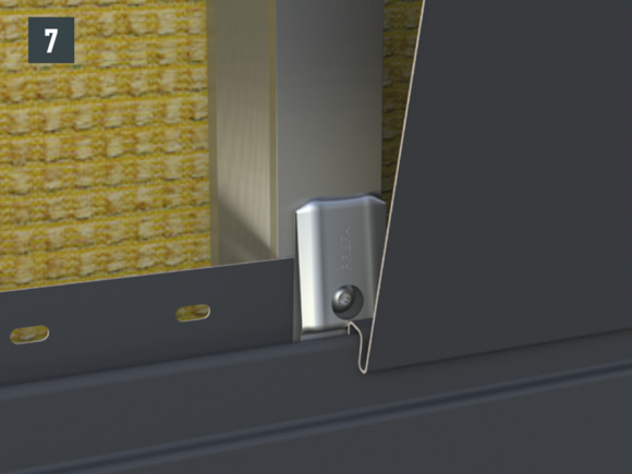 Stormclipset skruvas med i infästningslisten (fjäder) och håller den ovanpåliggande Sidingpanelen: