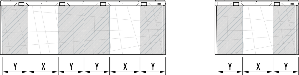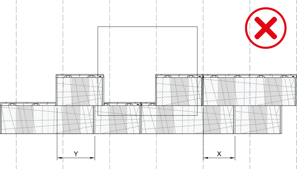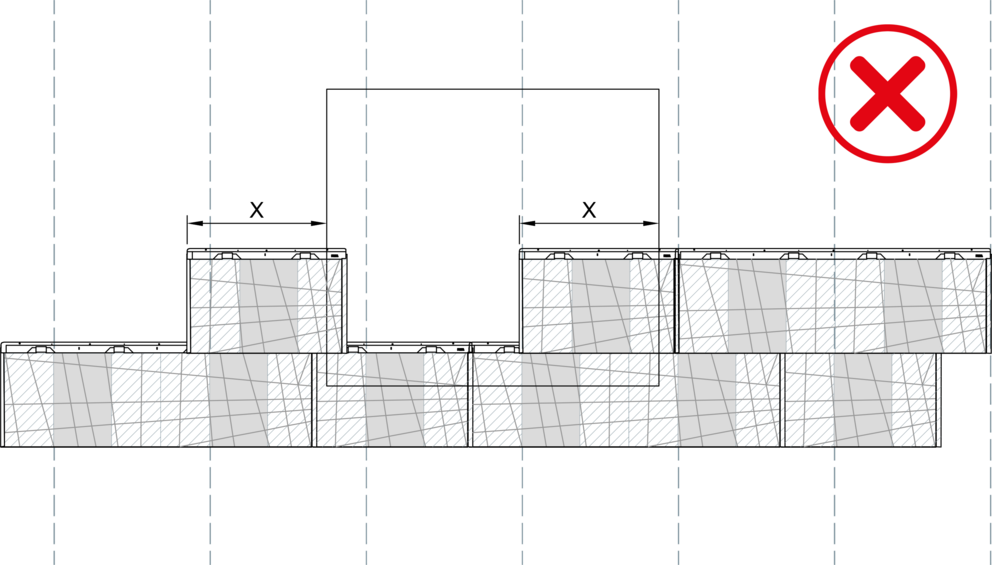Vid montering av fasadpaneler FX.12 får ingen vinkelfals läggas direkt över en annan. En förskjutning på minst 220 mm i sidled ska hållas. Vid en kombination av stora och små FX.12-paneler ska den vertikala skarven på den första panelen börja i område ”X” vid varje ny rad.
