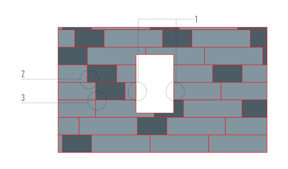 En avklippt FX.12-panel har återanvänts på andra sidan av öppningen (1). Därmed kan korrekt förskjutning inte längre säkerställas (2) och i värsta fall kan det leda till att skarvarna överlappar (3). Av denna anledning har vi tagit fram ett monteringsexempel för optimal skarvförskjutning.