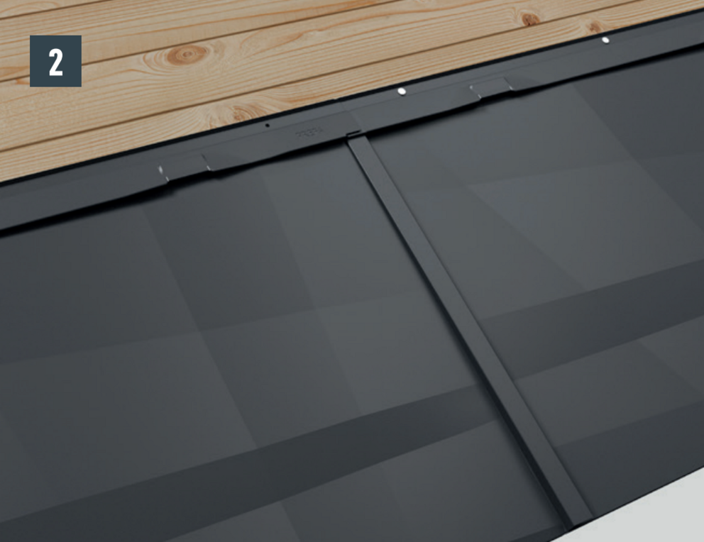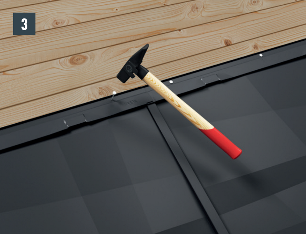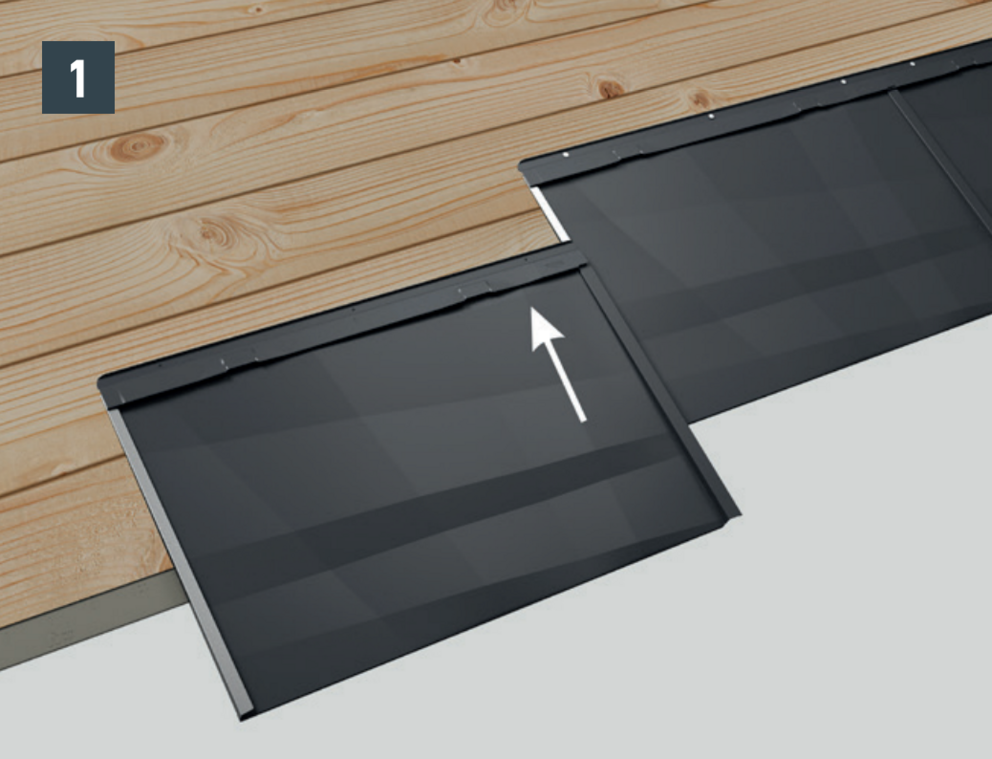 Passa in fasadpanel FX.12 och skjut in i falsarna. Slå lätt med hammaren på panelens underkant (bild 1).
