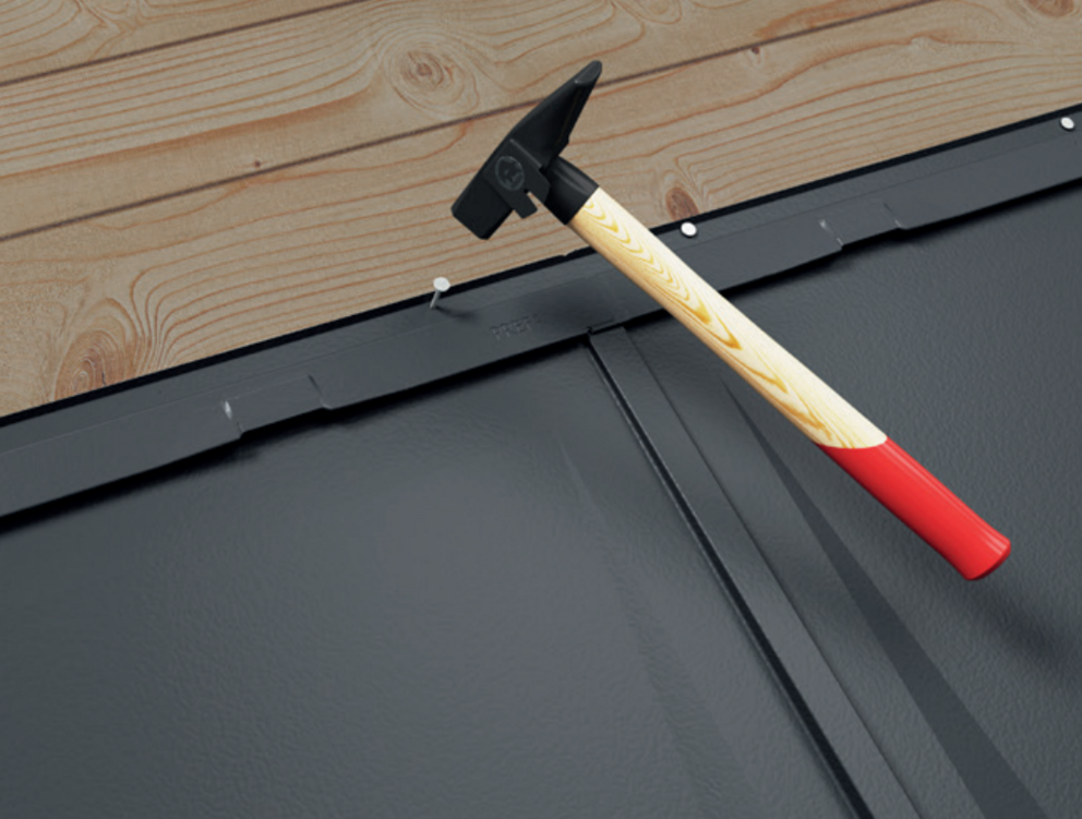 Passa in takplatta R.16 och skjut in i falsarna. Slå lätt med hammaren på plattans underkant.