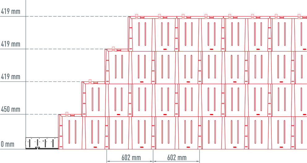 I praktiken görs ett vertikalt snörslag i färg efter var 5:e platta (1 505 mm) resp. efter var 10:e platta (3 010 mm).