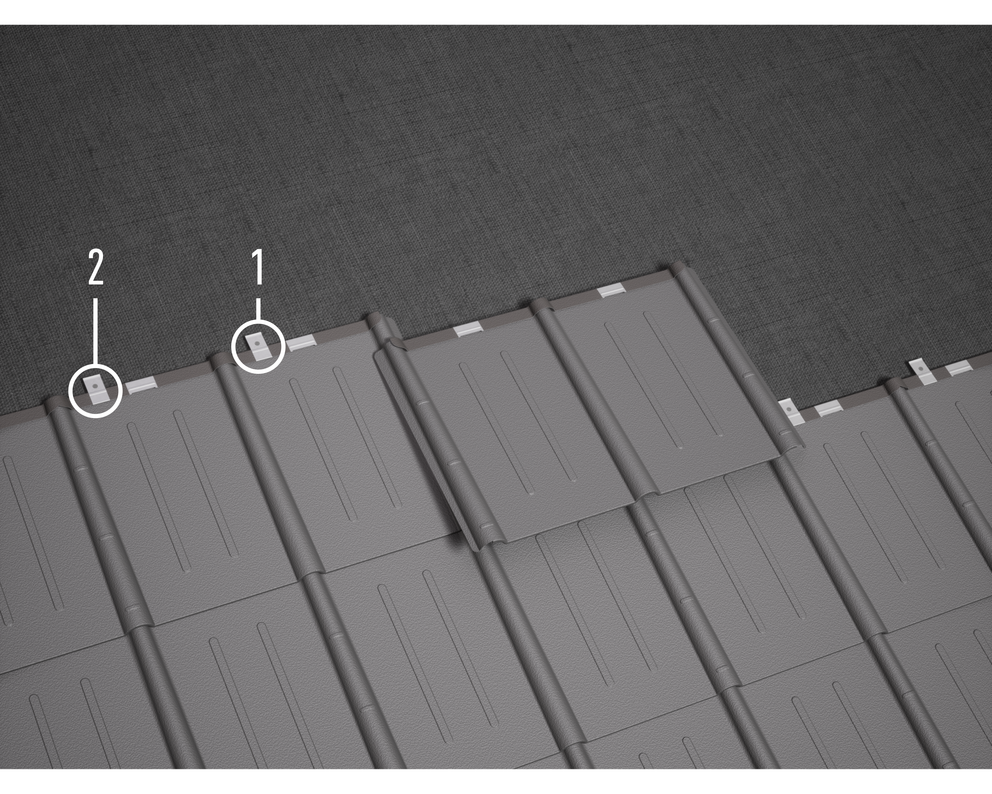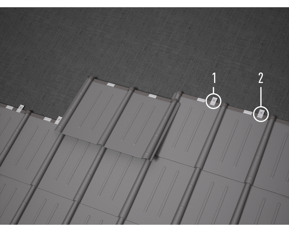 Klamrarna ska sättas ca 3 cm bredvid plattans rilla. I områden med stor risk för kraftiga vindar krävs en vindlastberäkning. Infästningen ska sedan ökas utifrån beräkningen eller skruvas i stället för att spikas. Om infästning med ökat antal klamrar enligt beräkningen inte är tillräckligt, kan dessutom en direkt infästning på sidan vid vågutgången (underliggande våg) med 2 st. SPAX-skruvar per platta användas.
