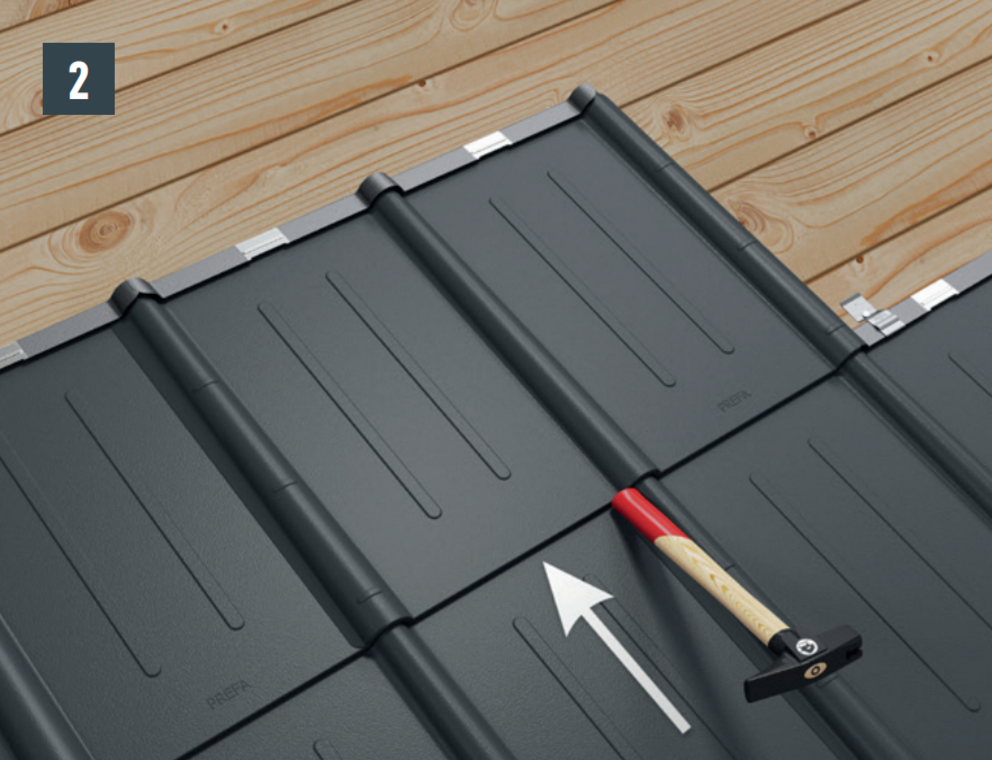 Tryck in plattan i hakfalsen. Slå lätt med hammaren på plattans underkant (bild 2).
