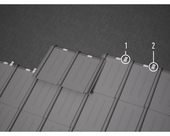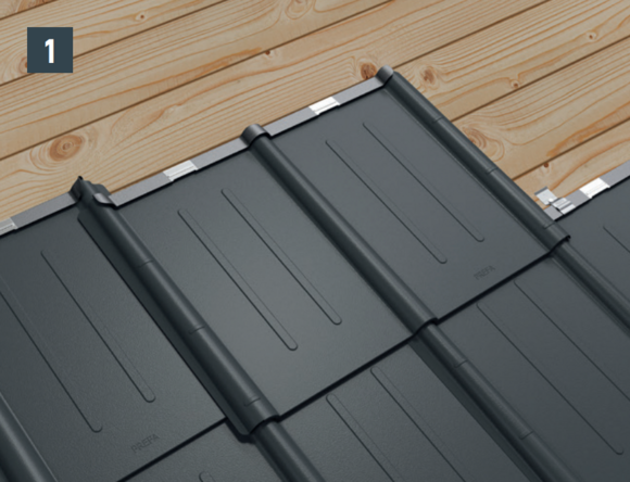 Takplattorna kan monteras i båda riktningarna. Takplattorna läggs alltid i förband, dvs. med förskjuten vertikal skarv. Halvplattor och halvmåneformade ventilationsöppningar kan även täckas skarv över skarv (bild 1).