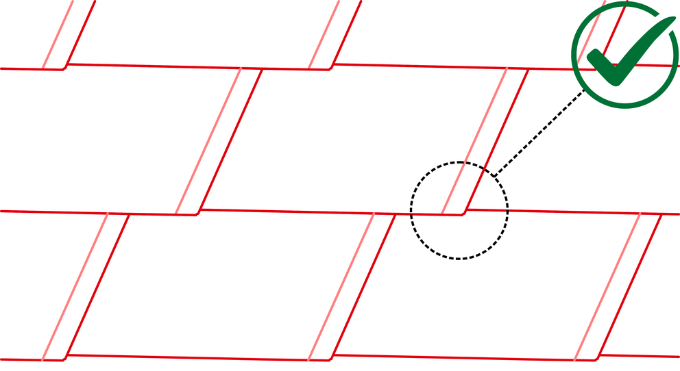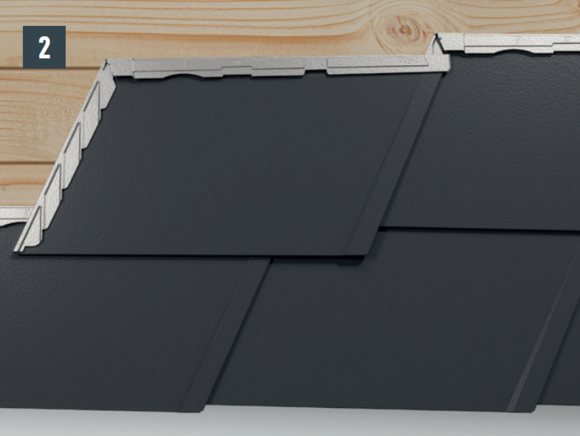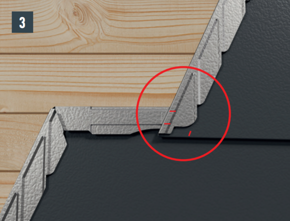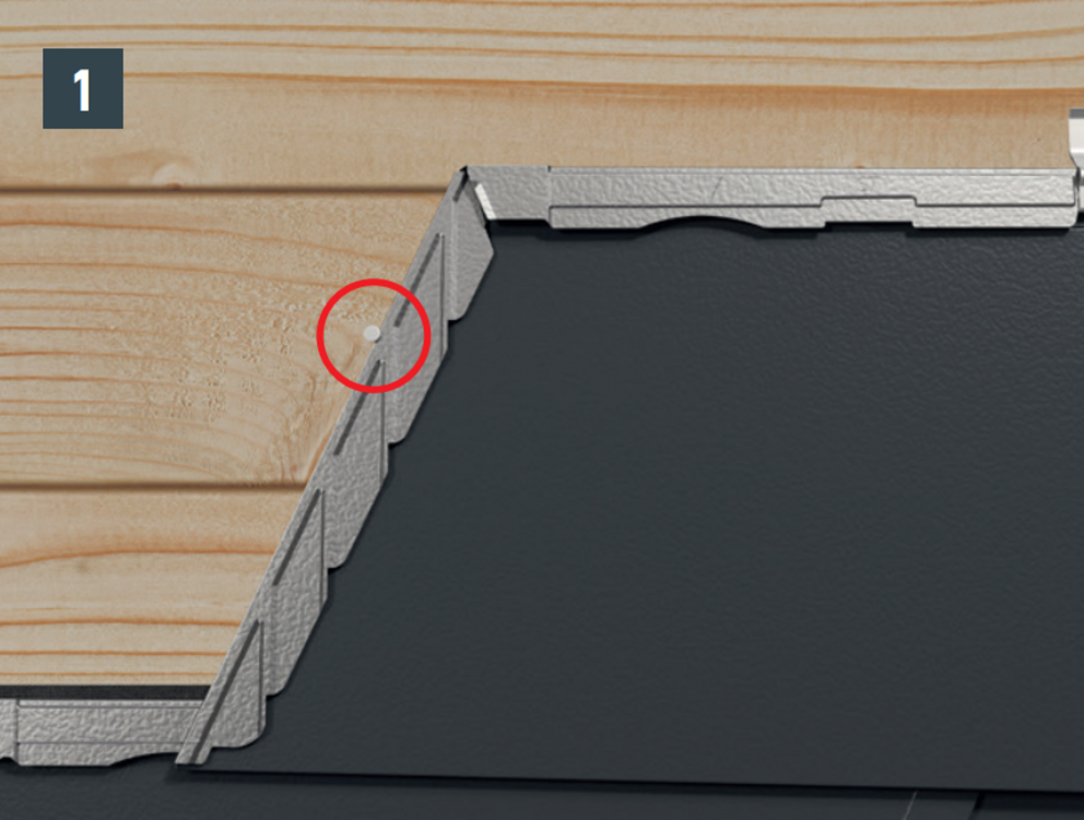 Genom formen på takshingel DS.19 bildas en nedsänkning vid hälen hos takshingel DS.19. Följ denna nedsänkning även vid monteringen av den första takshingeln DS.19 i varje rad, genom att inte skjuta upp den första takshingeln DS.19 helt i startskenan resp. falsen. Släpp ned hälen hos den första takshingeln DS.19 tills det övre shingelomslaget löper rakt längs hela längden. Övertäckning av den första takshingeln DS.19 måste undvikas.