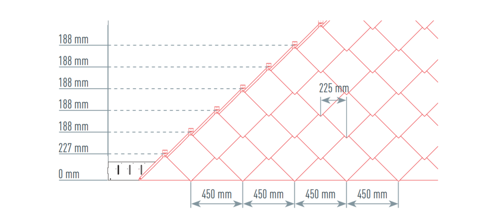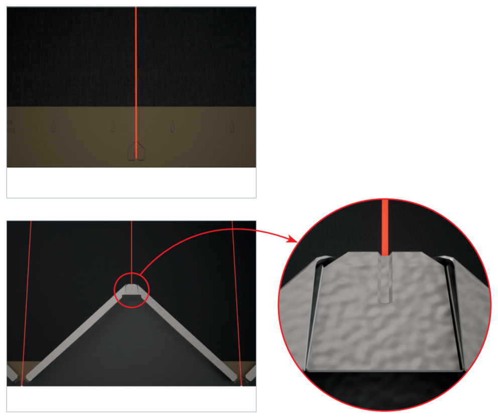 Som hjälp vid monteringen av PREFA väggromber 29 × 29 rekommenderar vi att du gör ett mönster av vertikala snörslag med ett avstånd på 450 mm (ta hjälp av startskenans markeringar). För att hålla det exakta snörmåttet i varje rad kan vid behov även halva snörmåttet markeras och kontrolleras med regelbundna avstånd. Rikta in startplattorna med skårorna (på startplattornas överkant) mot de vertikala snörslagen (se bilden nedan). Här ska man se till att området för kantuppvikningen på sidan (t.ex. sidoavslut resp. byggnadshörn) inte ligger mitt i väggromber 29 × 29 (beakta symmetri på fasadyta).