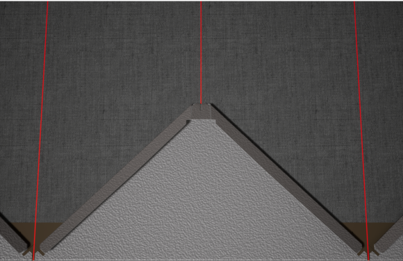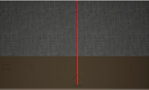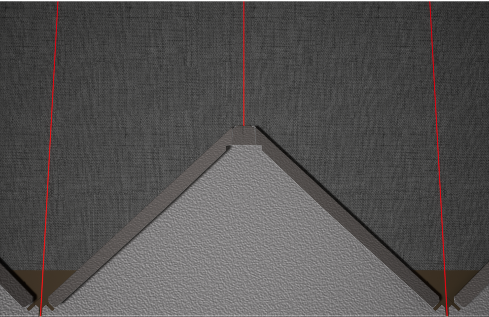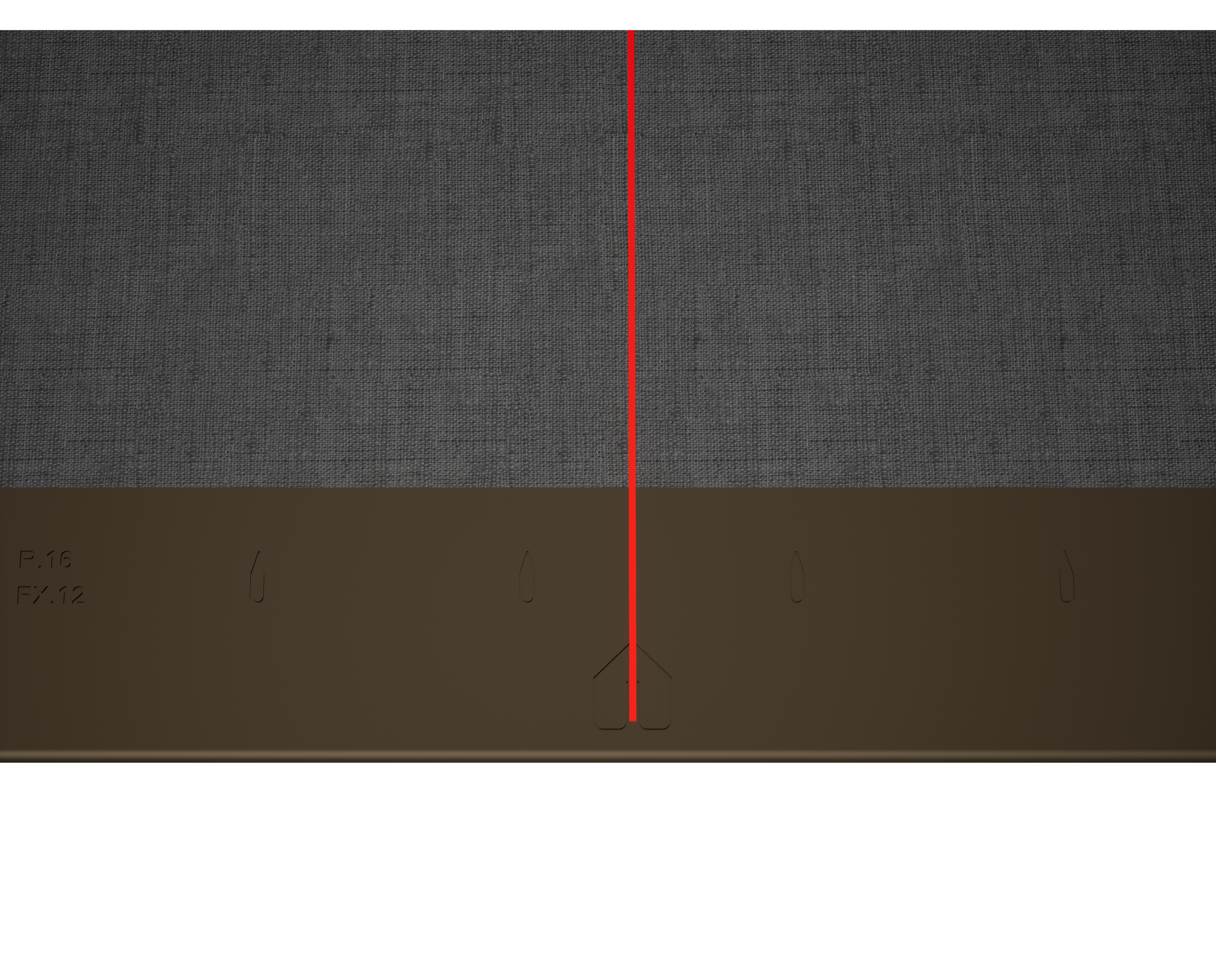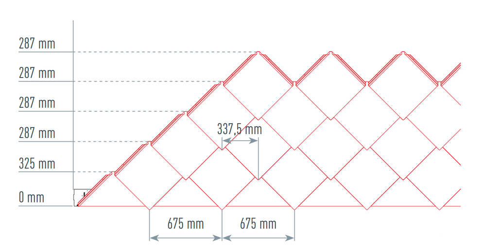 Som hjälp vid monteringen av PREFA-väggromber 44×44 rekommenderar vi att du gör ett mönster av vertikala snörslag med ett avstånd på 675 mm (ta hjälp av startskenans markeringar). För att hålla det exakta snörmåttet i varje rad kan vid behov även halva snörmåttet markeras och kontrolleras med regelbundna avstånd. Rikta in startplattorna med skårorna (på startplattornas överkant) mot de vertikala snörslagen (se bilden nedan). Här ska man se till att området för kantuppvikningen på sidan (t.ex. sidoavslut resp. byggnadshörn) inte ligger mitt i väggromber 44×44 (beakta symmetri på fasadyta).