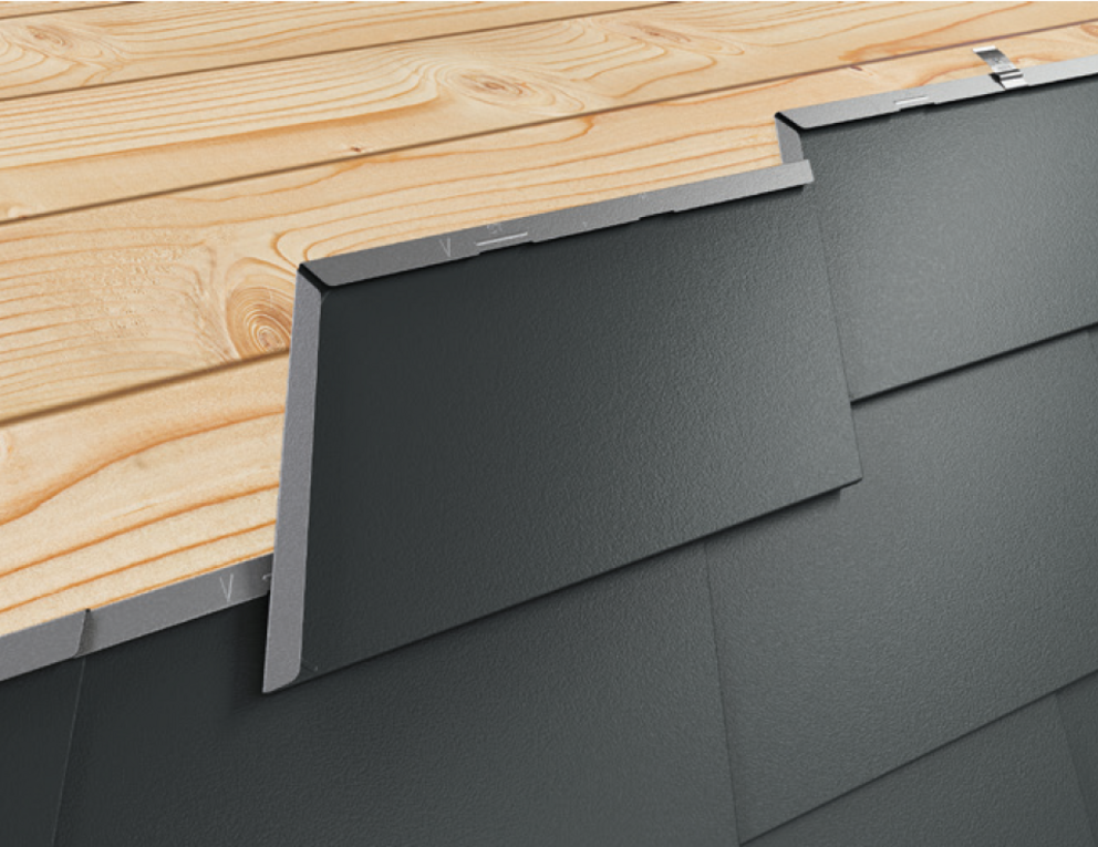 Genom formen på väggshingeln bildas en nedsänkning vid hälen på väggshingeln. Följ denna nedsänkning även vid monteringen av den första väggshingeln i varje rad, genom att inte skjuta upp den första väggshingeln helt i startskenan resp. falsen. Släpp ned hälen hos den första väggshingeln tills det övre plattomslaget löper rakt längs hela längden. Övertäckning av den första väggshingeln måste undvikas. Se till att det övre plattomslaget löper rakt längs hela längden vid anslutningen till ränndalen.