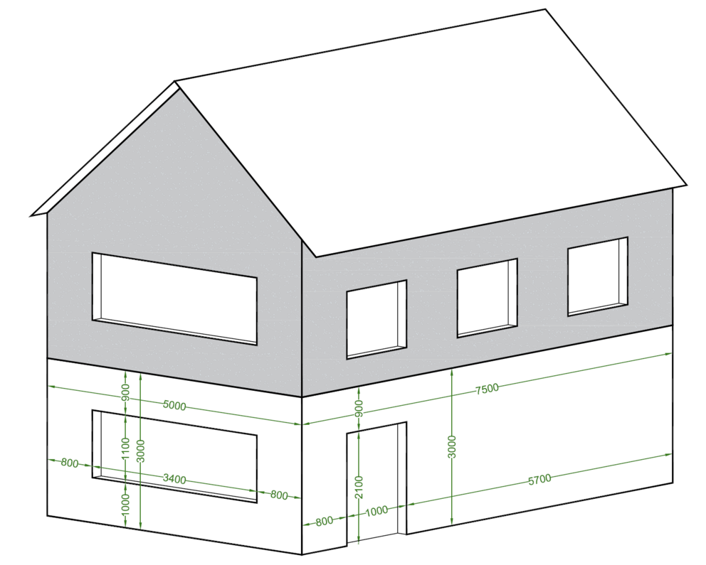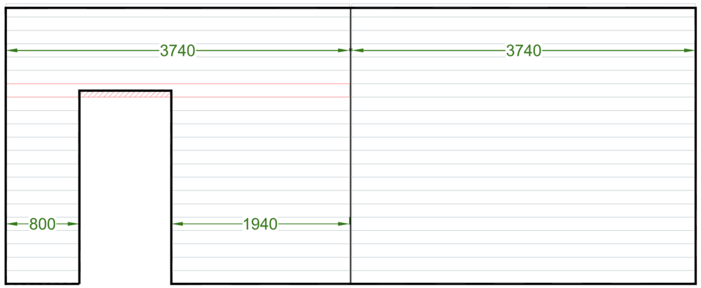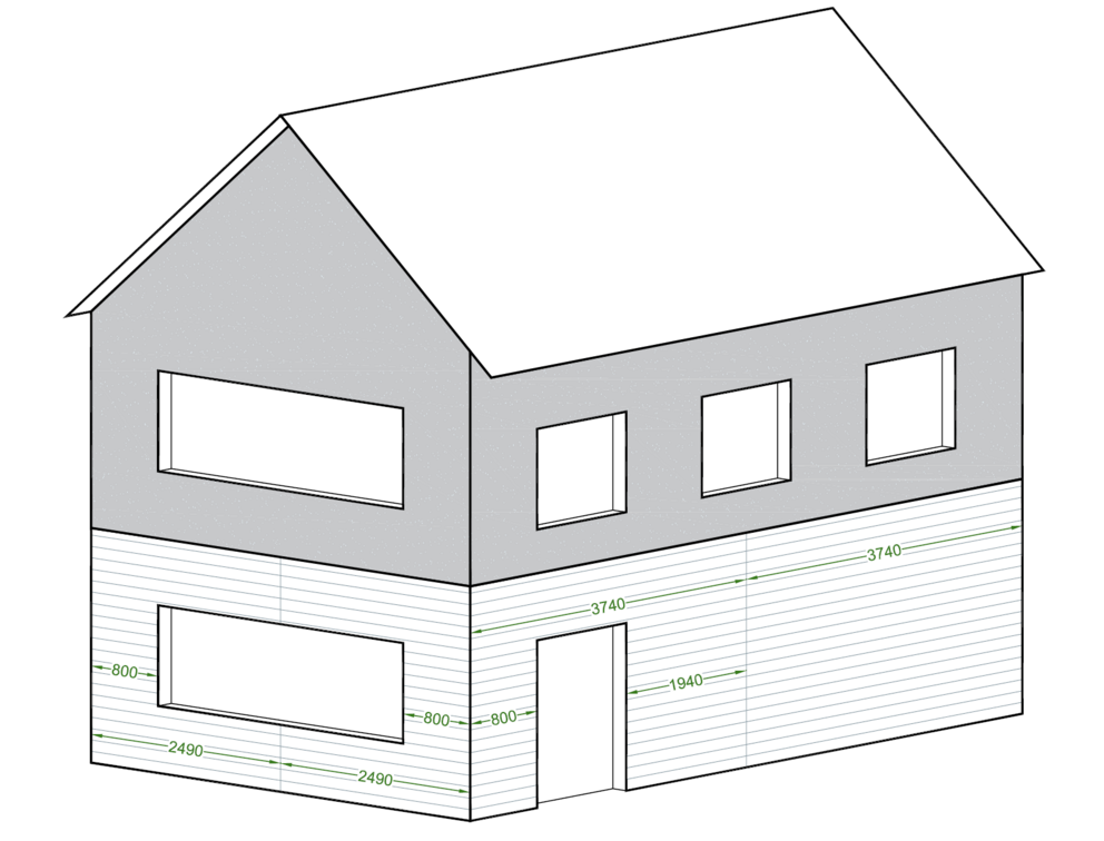 Öppningar, till exempel fönster och dörrar, som delvis går in i en profil ska inte beaktas vid materialberäkningen utan anpassas på plats (rödmarkerad yta).