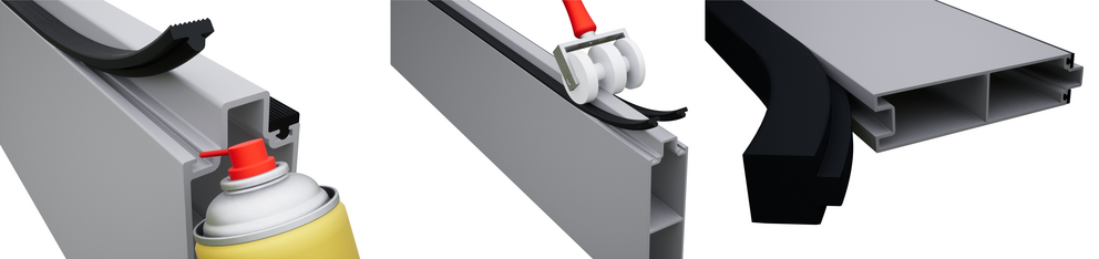 • Tryck in dämmbalkstätningen i båda spåren på ovansidan av dämmbalken. Som monteringshjälpare kan tätningsroller och silikonspray användas för att underlätta intryckningen. Montera marktätningen på undersidan av dämmbalkarna.