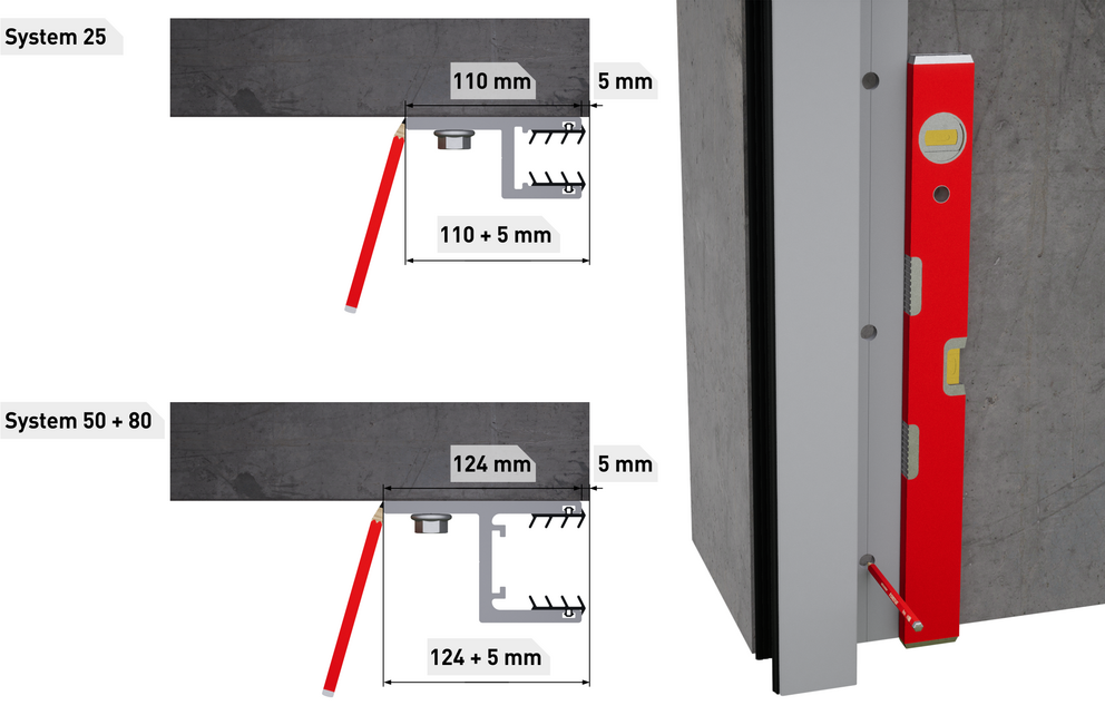 • Justera grundprofilens ytterkant lodrätt från mätpunkten och dra tillbaka den cirka 5 mm från valvkanten, markera och borra monteringshålen. Innan grundprofilerna monteras ska eventuella ojämnheter jämnas ut, och vid behov ska underlaget spacklas eller efterbehandlas.