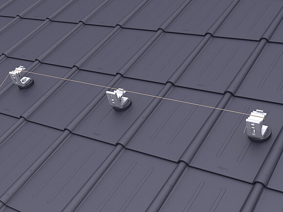 I den nedersta modulraden på en generatoryta ansluts därvid två fallsäkringar per solpanelsmodul till den övre (mot nock belägna) modulskenan.