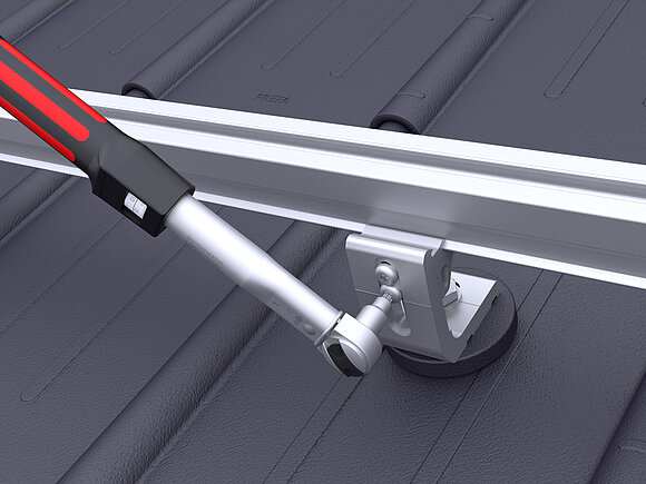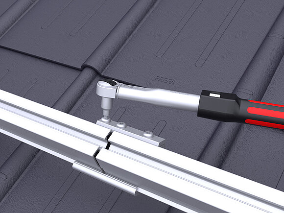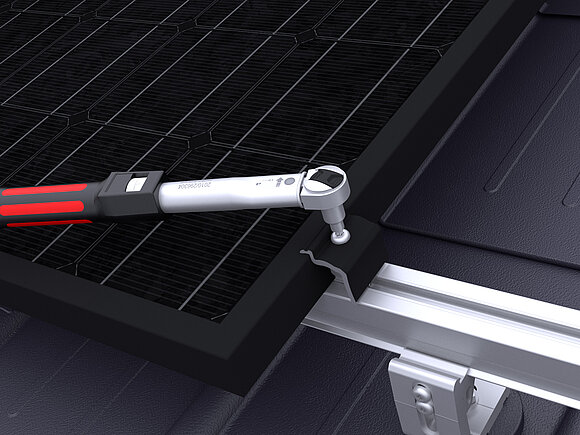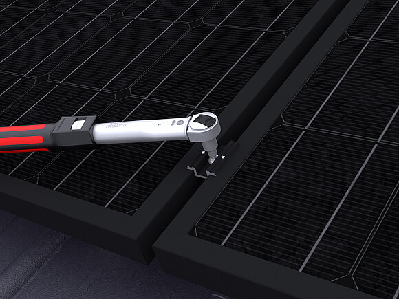 Därefter placeras modulerna, och mitt- respektive ändklämmorna dras åt med ett åtdragningsmoment på 15 Nm.