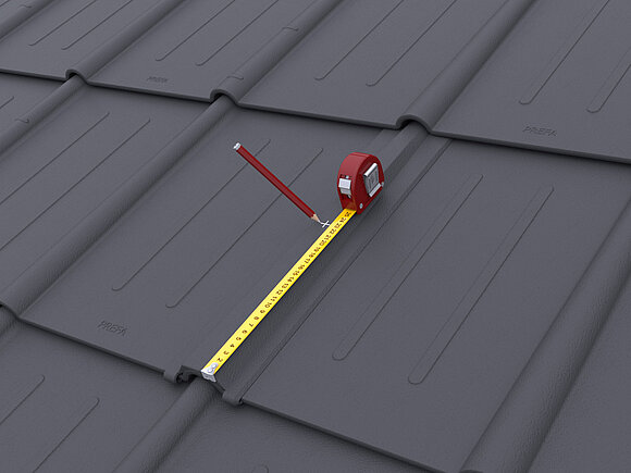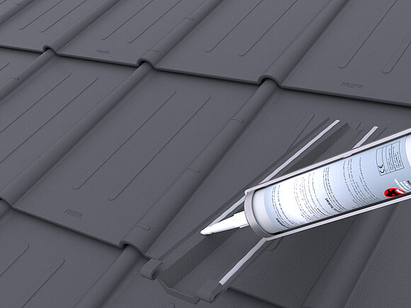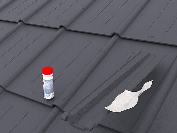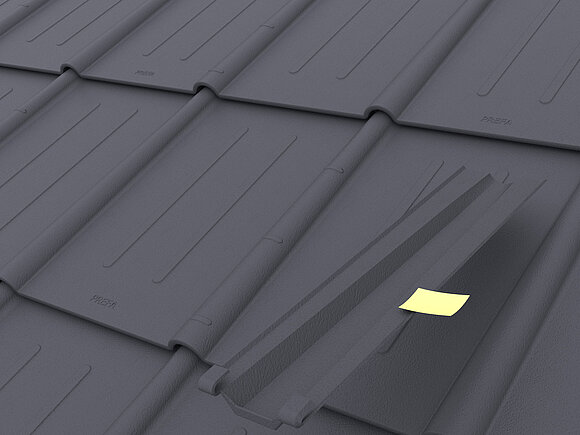 Slipa och rengör limytan på Sunny Spezial och på takplattan. Applicera speciallim på den slipade och rengjorda Sunny Spezial. Skjut in Sunny Spezial i området för överlappningen eller mittrillan i den övre falsen på takplattan och vik ner. Skjut Sunny Spezial så långt som möjligt upp in i falsen.