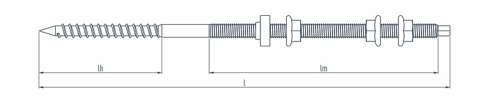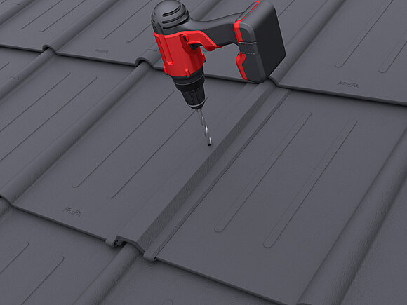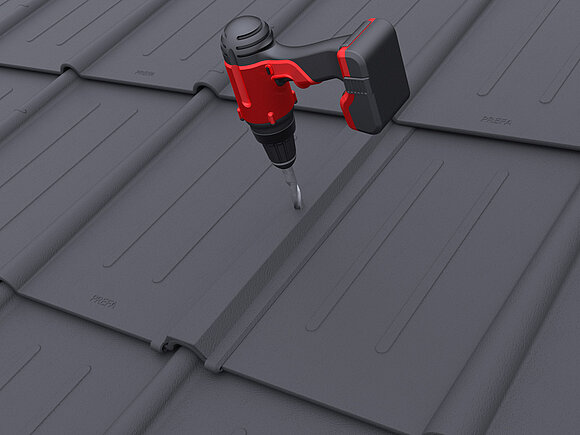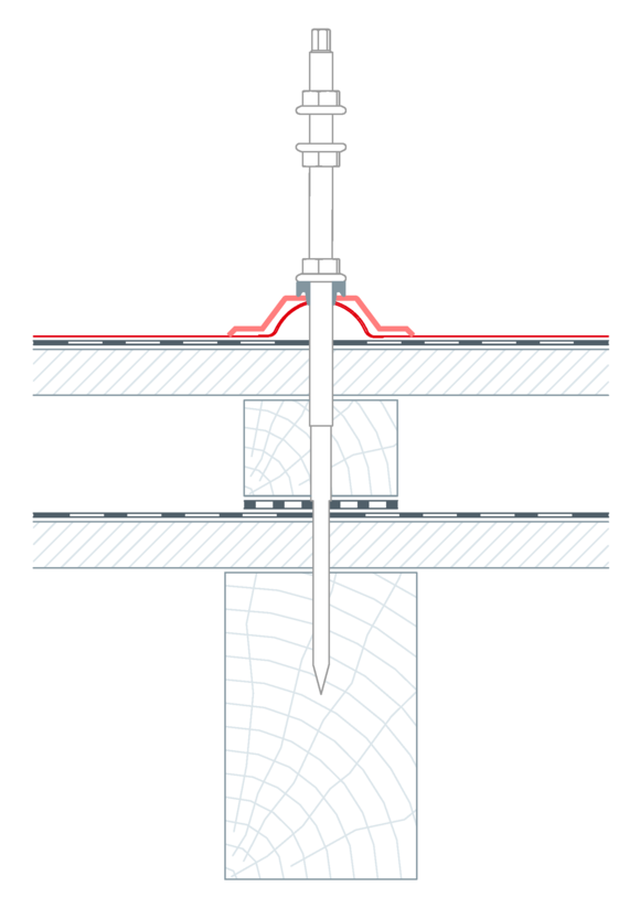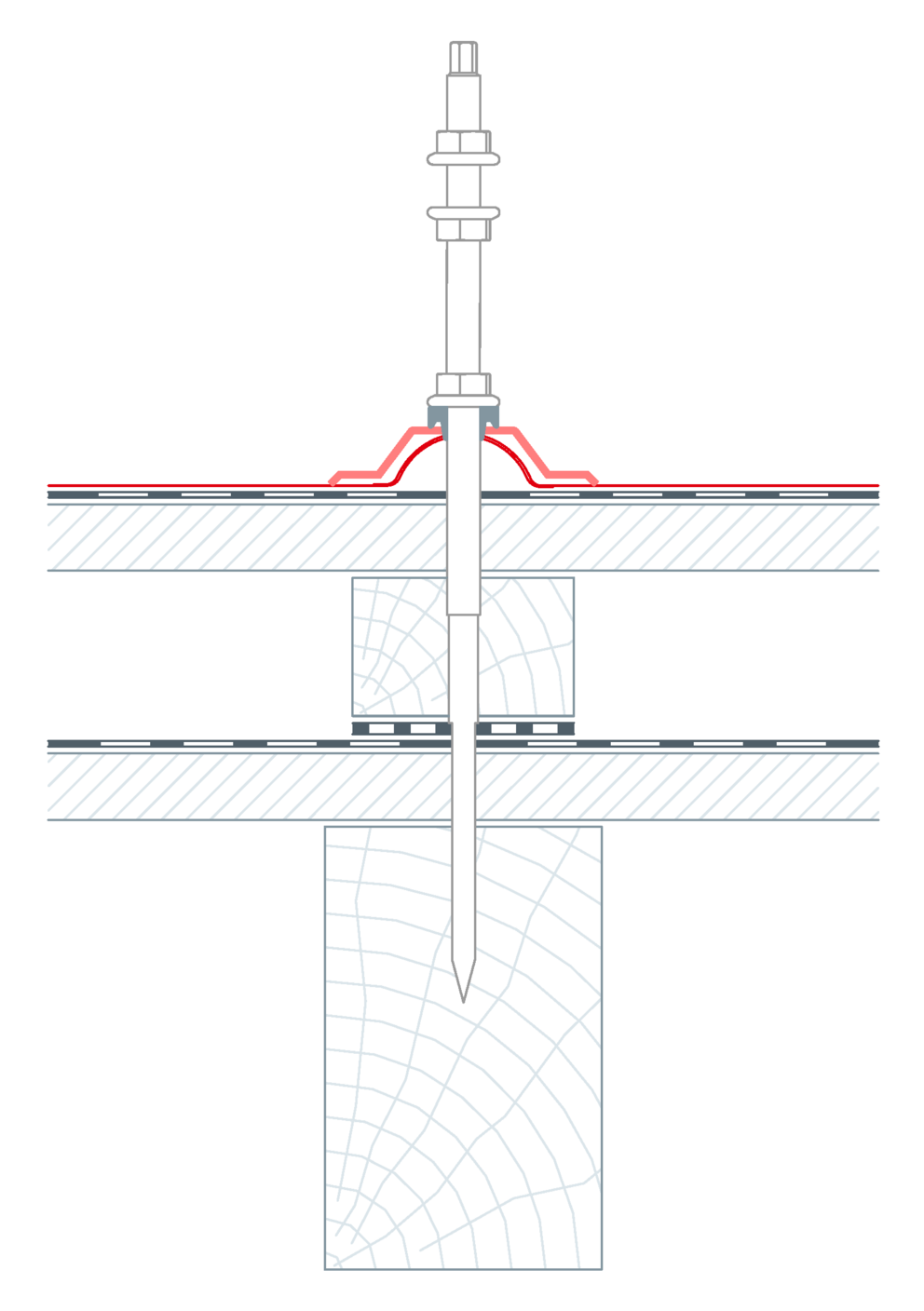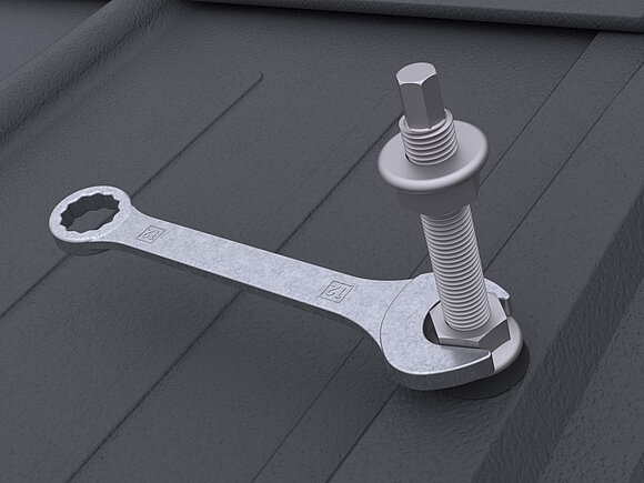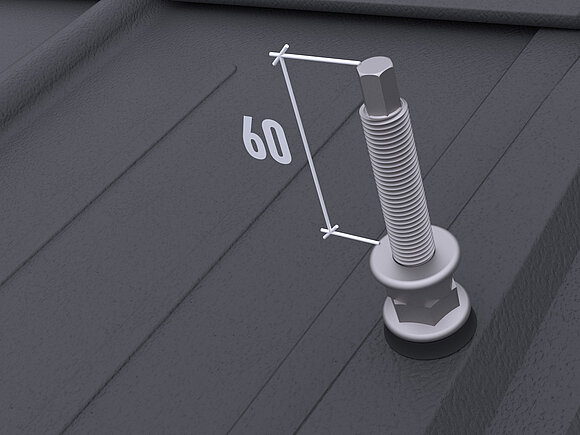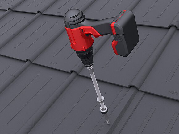 Markera positionen för stockskruven. Förborra träkonstruktionen med ⌀ 8 mm. Borra upp Sunny Spezial och takplattor med ⌀ 13 mm. Skruva i stockskruv med borrmaskin (hylsnyckel : SW 9). Inträningsdjup i den bärande underkonstruktionen (takstolar): minst 80 mm.