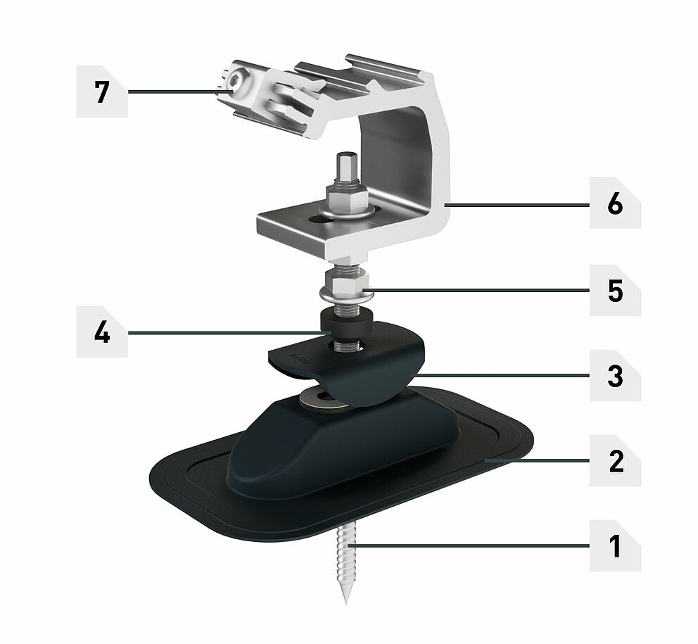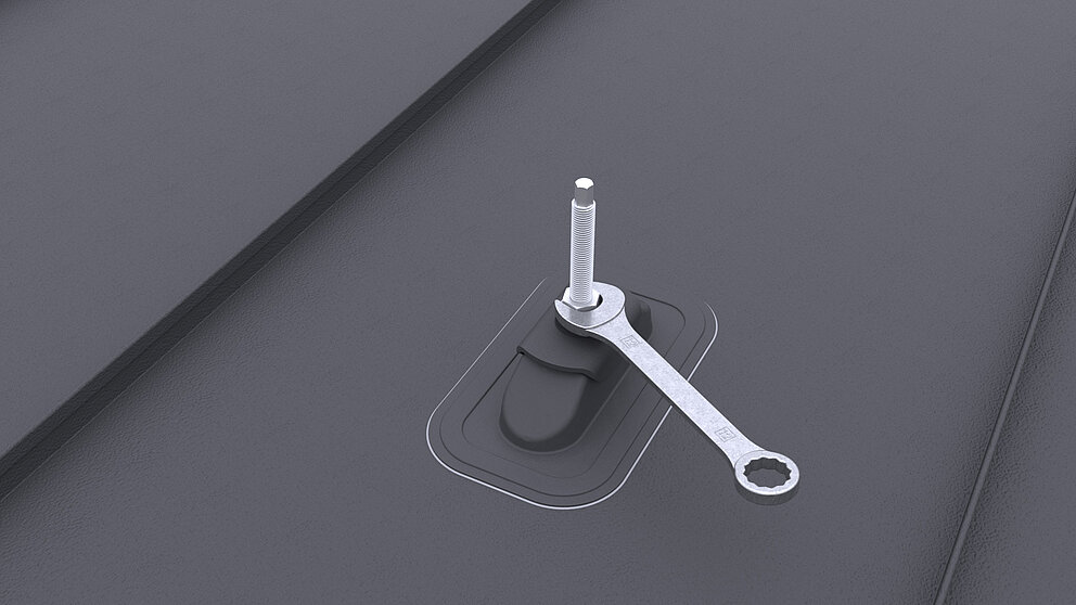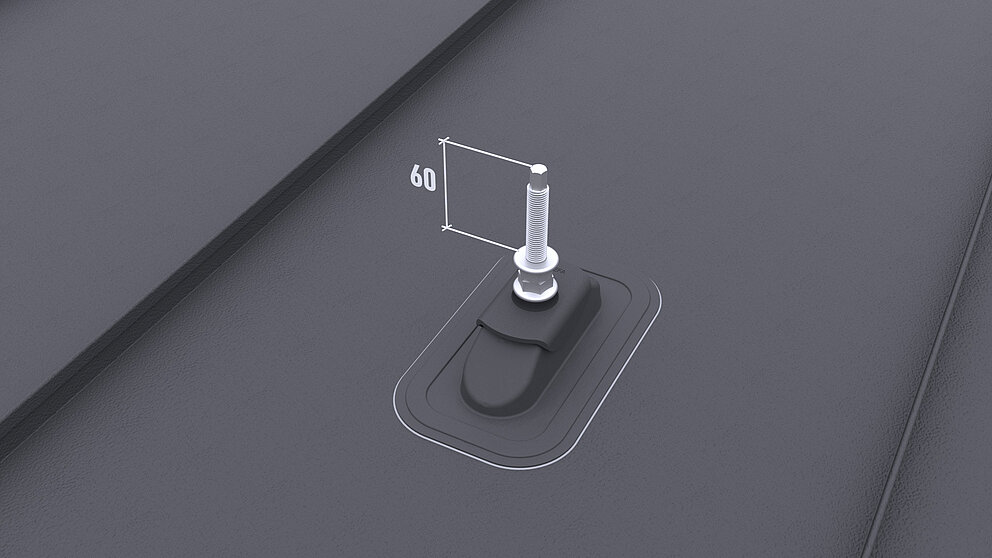 Dra åt muttern tills EPDM-tätningen välvs utåt (blocknyckel: SW 18). Montera den andra muttern och skruva den hela vägen ned. Mät upp 60 mm uppåt från den andra mutterns överkant (anliggning för skenhållare) på stockskruven och kapa där. Sätt på skenhållaren och dra åt med två blocknycklar på motsvarande höjd (i nivå med de övriga solpanelhållarna) (blocknyckel: SW 18).