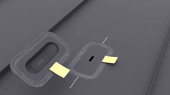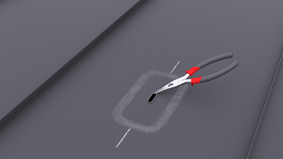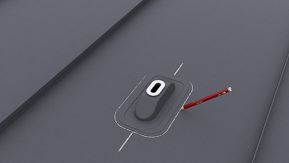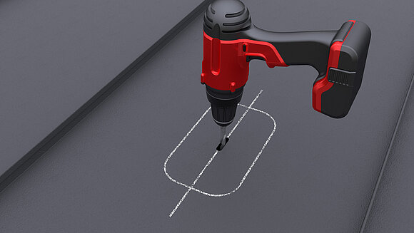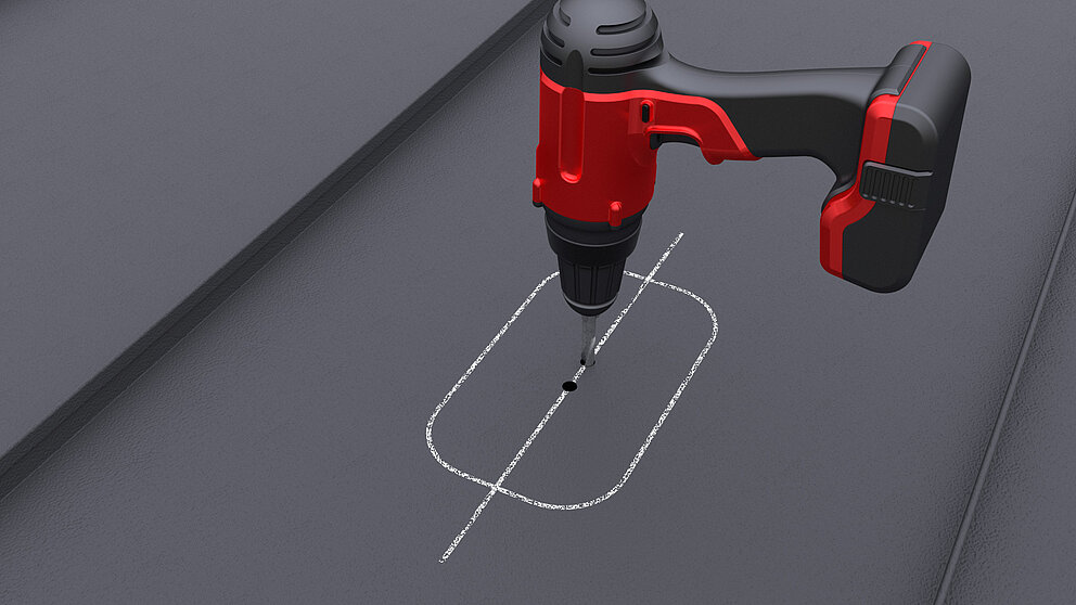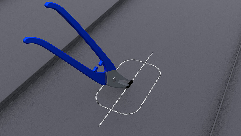 Markera konturer och avlångt hål. Förborra avlångt hål (⌀ 13 mm) i PREFALZ-plåten (borrning räcker för små format). Skär ut avlångt hål i PREFALZ-plåten (behövs inte för små format).
