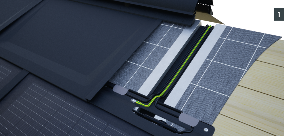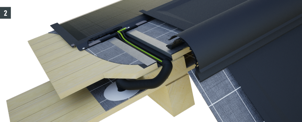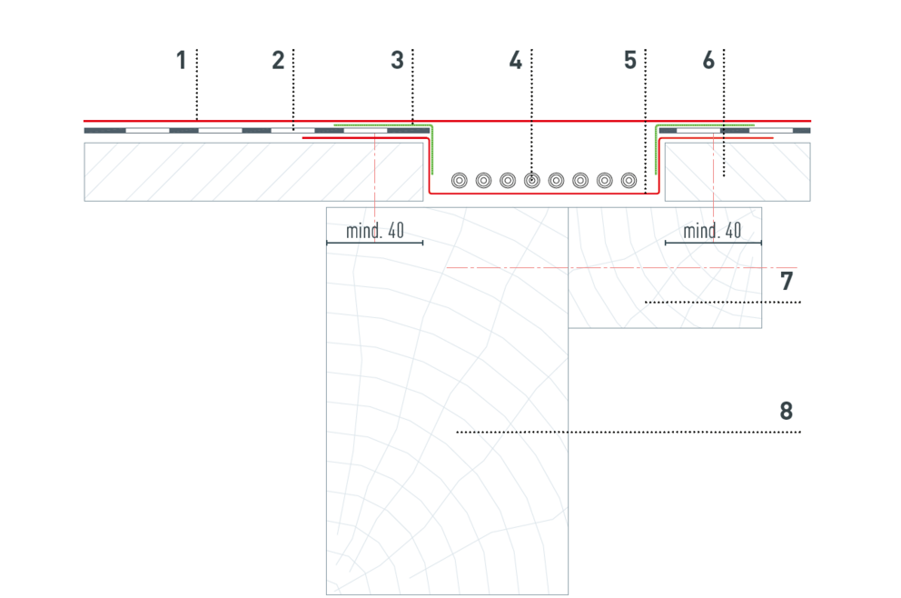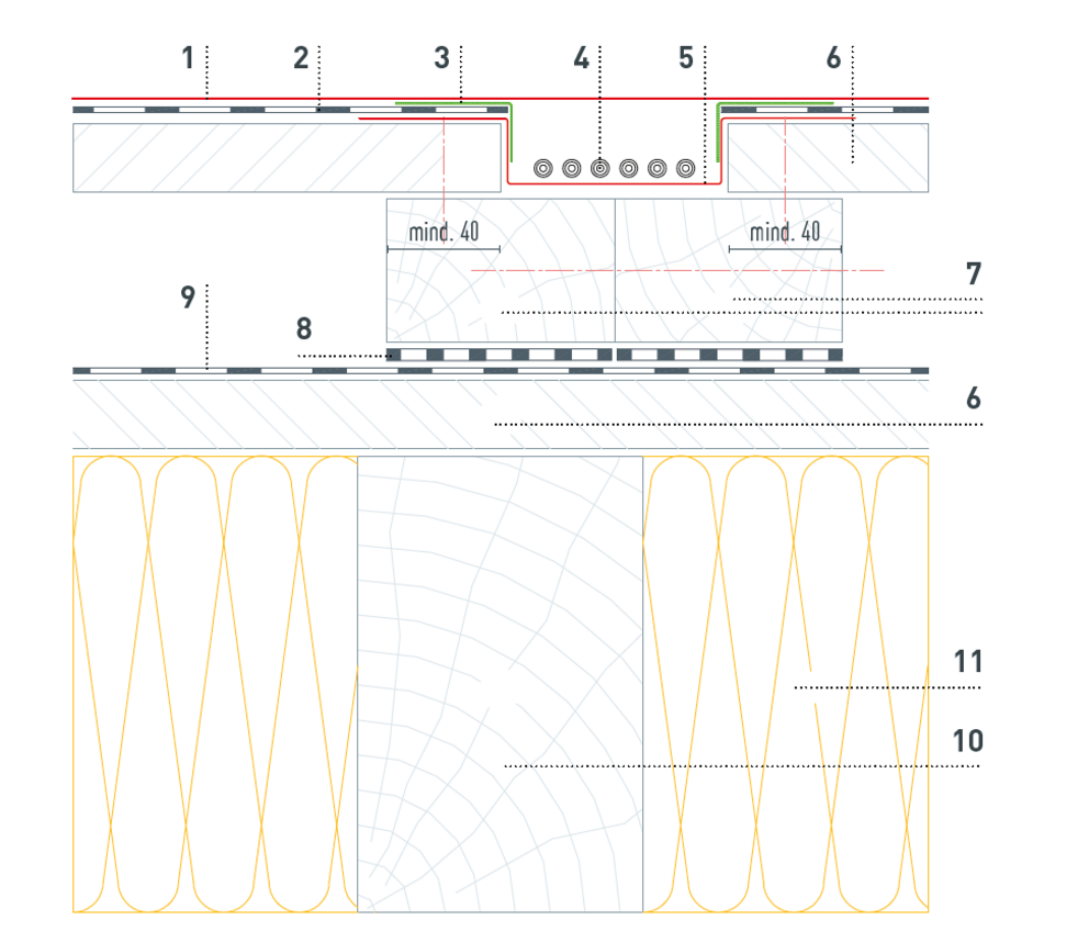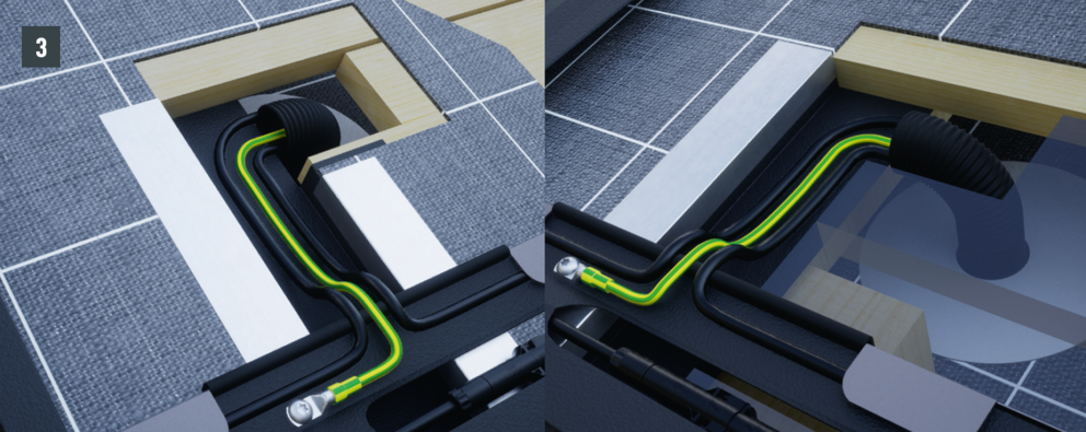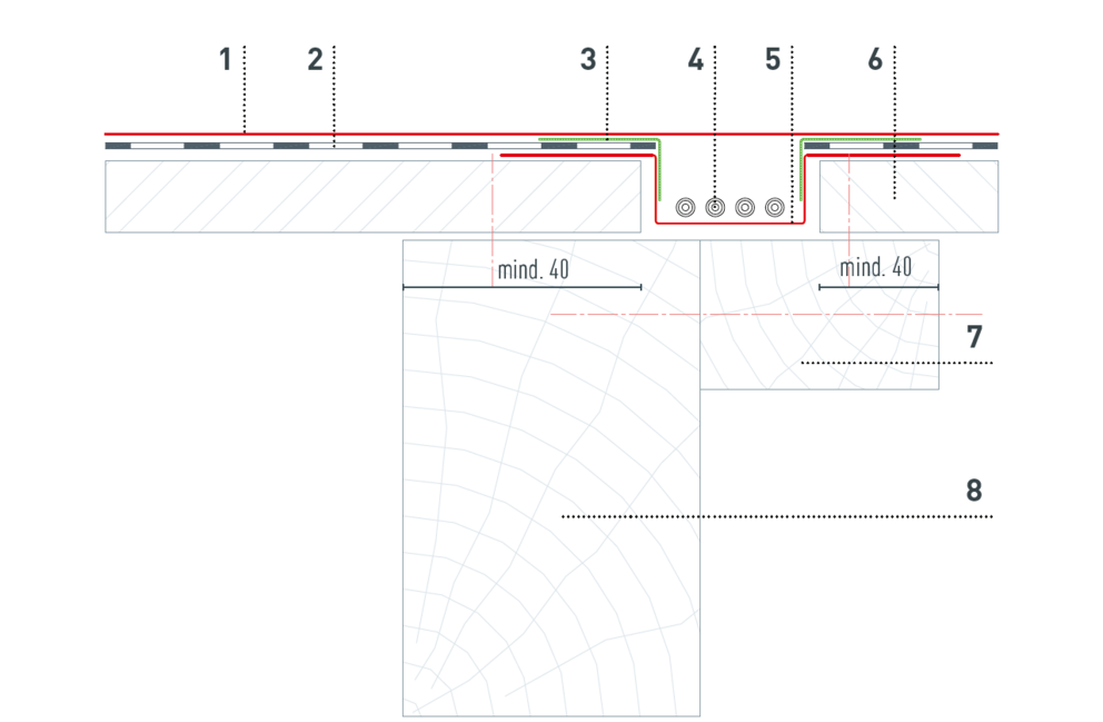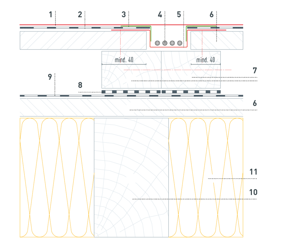 På grund av nödvändig kabelföring måste underkonstruktionen i trä tillverkas enligt följande detaljer. Kabelkanalerna antal och positionering definieras av PREFA Produktteknik och visas i solcellsanläggningens monteringsanvisning.