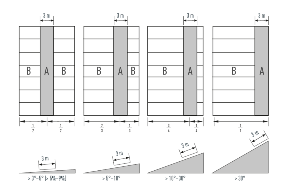 Längden på området med fasta klamrar ska vara 3 meter. Klammerområdets position väljs normalt beroende på taklutningen – se bilden nedan samt tillhörande tabell. Genomföringar eller takformen kan påverka klammerområdets position. Områden där klammerområdets position varierar ska separeras med skiljelister.