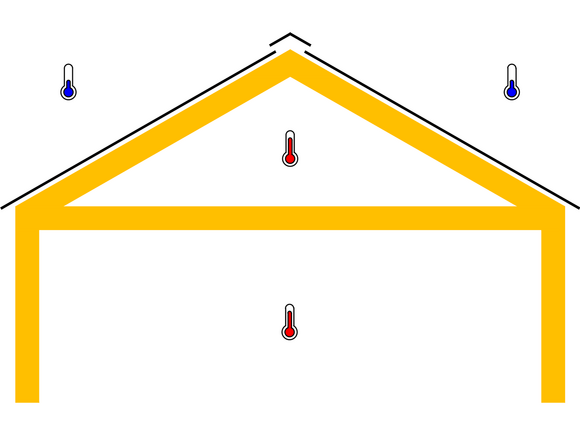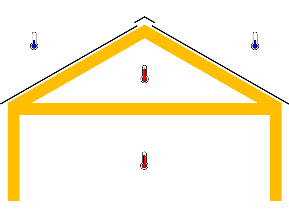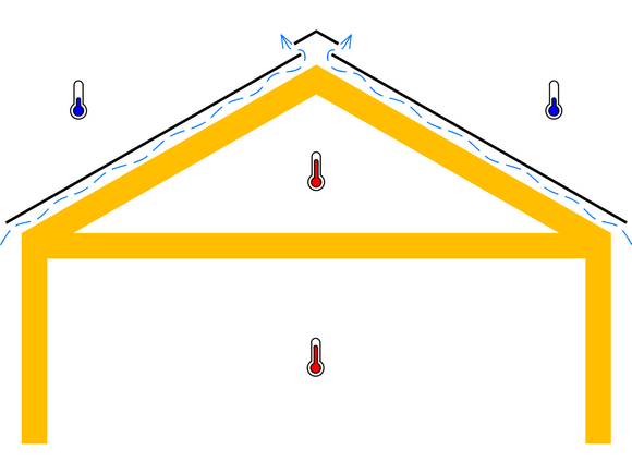 Vid ventilerade (ouppvärmda) takutrymmen är värmeisoleringen placerad i området kring den översta våningen. Det överliggande takutrymmet förblir oisolerat och fullständigt ventilerat. Utomhusluft kan strömma in genom öppningar i takfoten och gaveln och strömma ut igen över nocken.