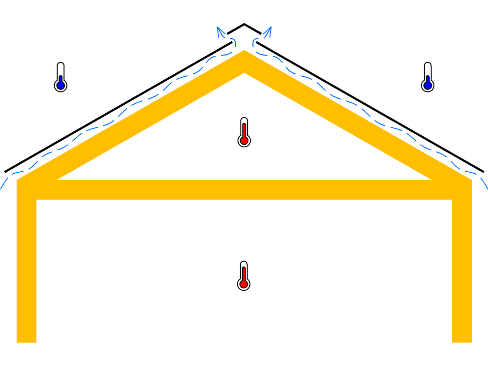 Ventilerade takkonstruktioner har använts i decennier och visat sig fungera bra under alla klimatförhållanden. Vi rekommenderar därför att PREFA aluminiumtak monteras med ventilerad underkonstruktion.