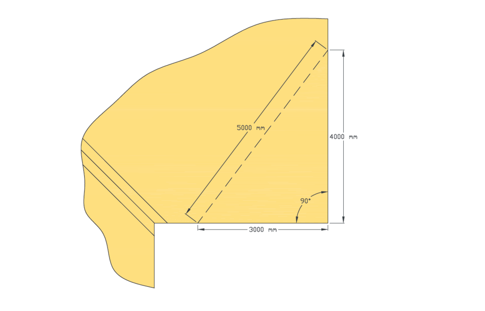 Markera först önskad hörnpunkt. Markera därefter en sträcka på 3 m längs den kant där den räta vinkeln ska uppstå. Mät nu ut en sträcka på 4 m från samma hörnpunkt ungefär i den önskade riktningen för den räta vinkeln.