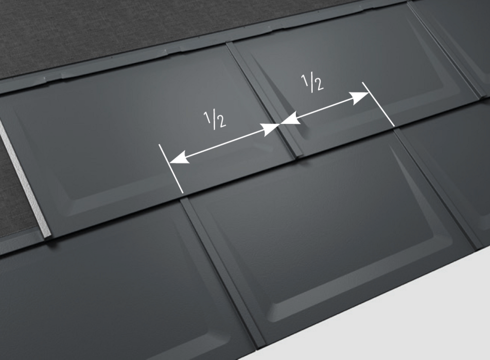 För att underlätta montering med halv förskjutning finns en markering på den övre falsen hos takplatta R.16.