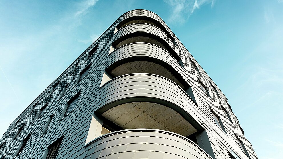 Den nya byggnaden kombinerar solid massiv byggnadsteknik med en extraordinär estetik. Detta beror dels på den kantfria triangulära byggnadsformen. Å andra sidan är dess "fjälliga reptilhud" av små PREFA väggshingel i färgen P.10 ljusgrå som en jämnt löpande metallfasad ett verkligt blickfång. Dessutom är det ett bra val, eftersom väggshingels format gör det möjligt att lägga dem även i en liten radie och därmed skapa de rundade hörnen. "Direkt bakom vår byggnad börjar traditionella schweiziska enfamiljshus och de är också täckta med plattor," förklarar Keller sitt kreativa designval.
