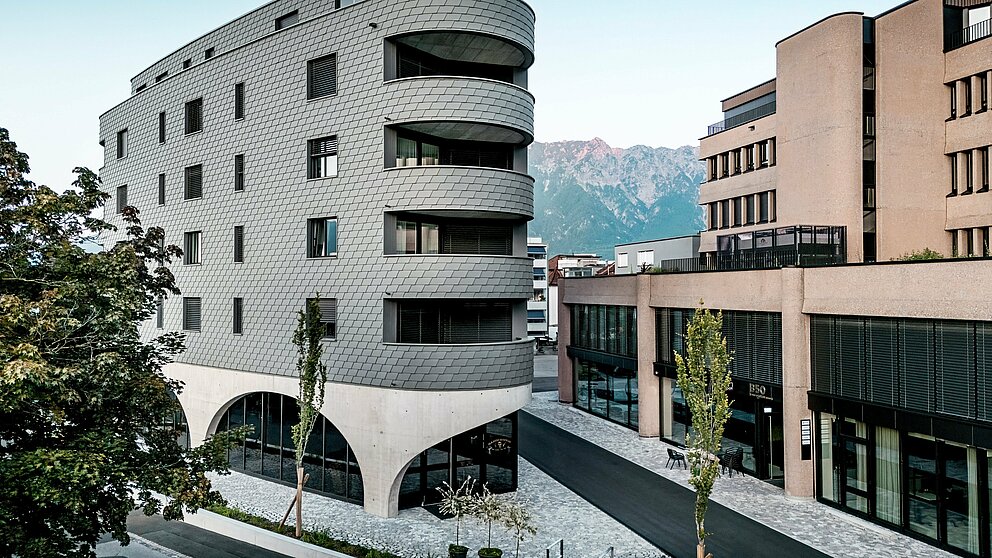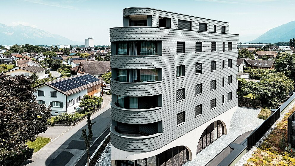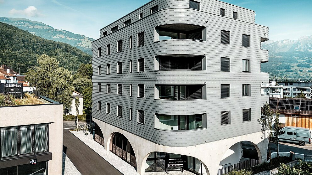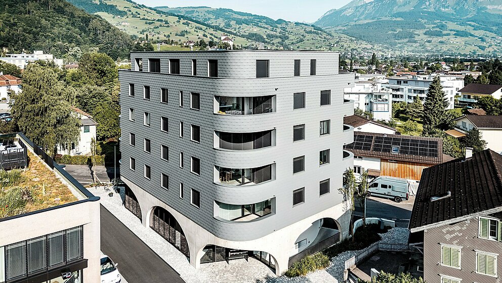 "Arkitektoniskt tilltalande, tekniskt en stor utmaning," säger Gabriel Landolt från Künzli Davos. Det schweiziska traditionella företaget genomförde den fjälliga fasaden och har i flera år använt PREFA:s kvalitet: "Dels är materialet mycket lätt och samtidigt väderbeständigt. Visuellt skapar man en homogen yta som är stilistiskt tidlös och särskilt hållbar. Precis som alla PREFA-produkter är även de väggshinglorna som används i Buchs underhållsfria. Och aluminiumet kan återvinnas hållbart som sekundär råvara."