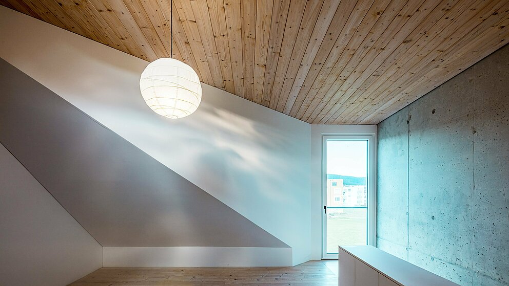 Med sin monolitiska form och monokroma, vita fasad utstrålar det iögonfallande hörnhuset purism och geometrisk perfektion. Två byggnadskroppar – den ena med platt tak, den andra med sadeltak – binds samman i en L-form. Tillsammans skapar de en skyddad innergård med en täckt terrass. Klassiska takutstick saknas, i stället framhävs avslutningarna vid gavlar, takfot och krönbeslag. Invändigt öppnar sig flera rum hela vägen upp mot taket. Genomtänkt placerade fönster leder blicken ut mot landskapet, medan det stora fönstret i takkupan släpper in rikligt med ljus och ger rummet djup. Slipade betonggolv, ljusa träytor av silvergran och vitlaserat trä ger interiören en elementär klarhet och skapar en stillsam, harmonisk helhet.