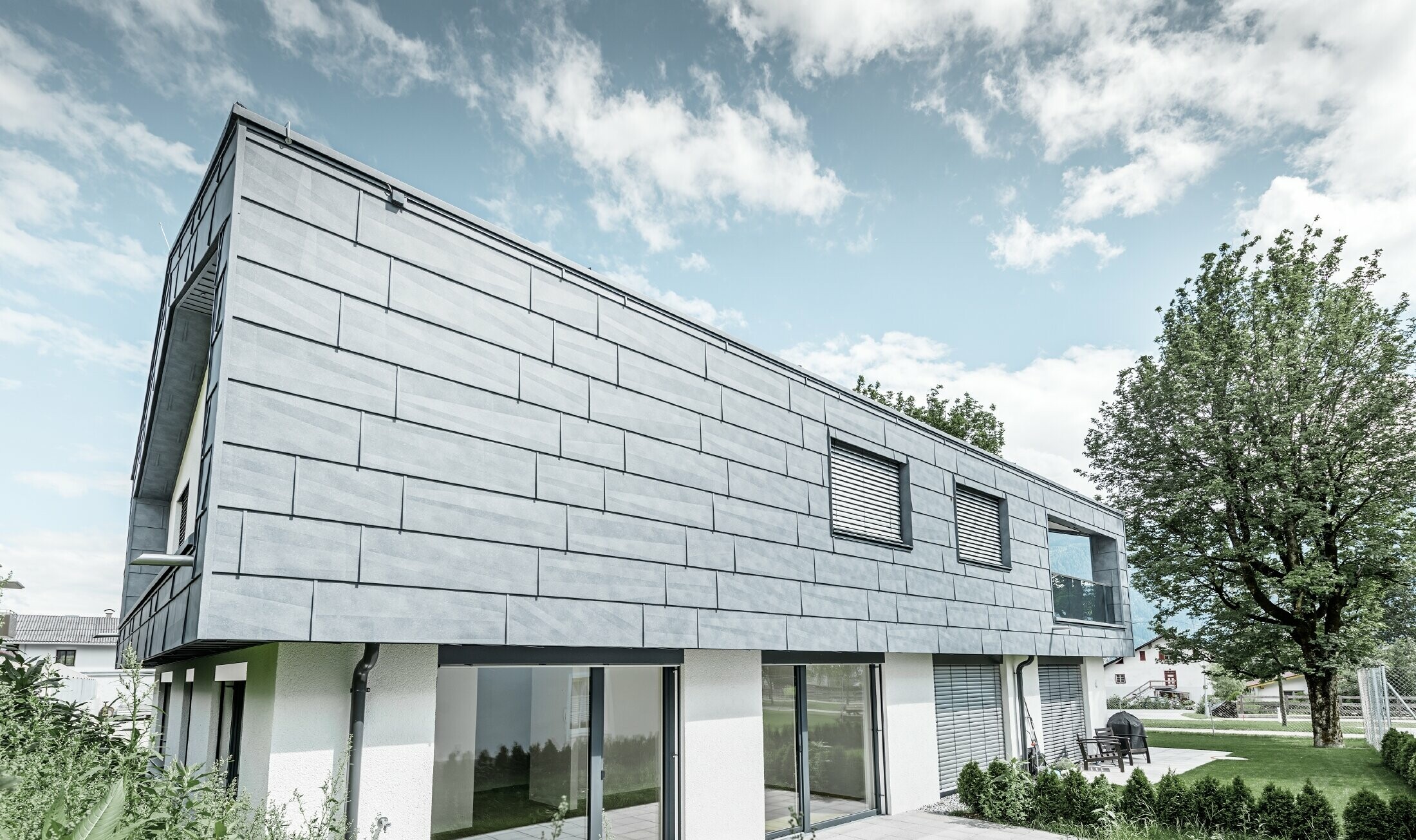 För bostadshuset i Mieming kläddes hela övre delen av byggnaden med PREFA fasadpanel FX.12 i P.10 stengrå. Även på taket lades FX.12 i stengrått.