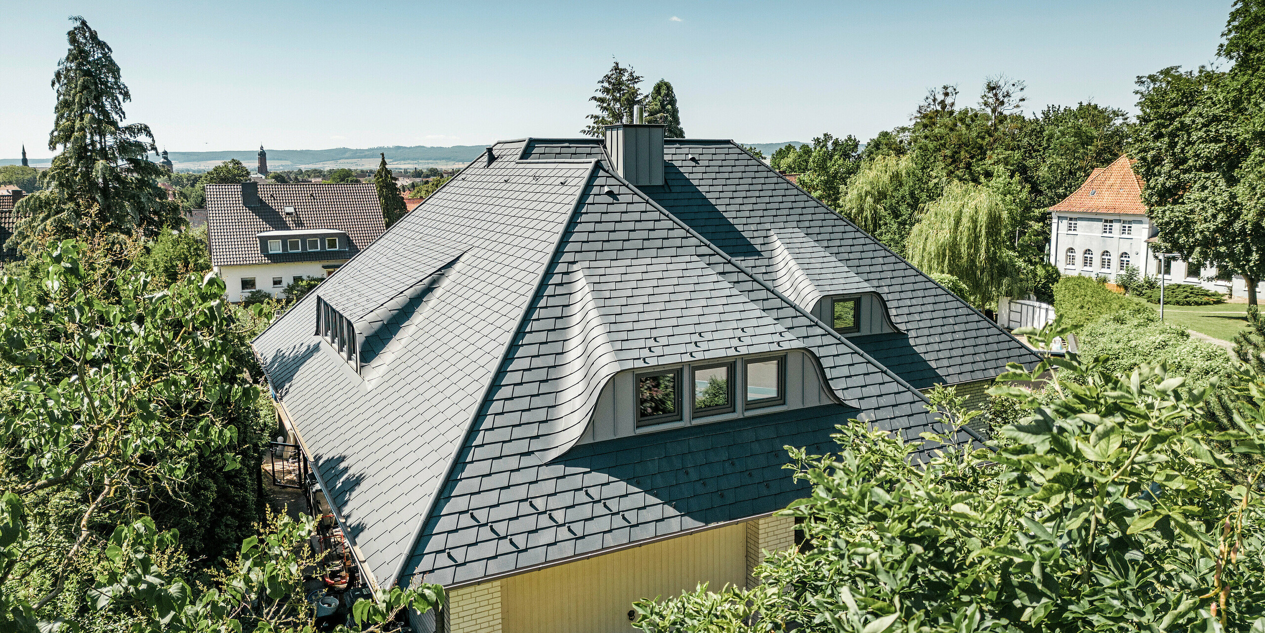 Det unika taklandskapet i detta enfamiljshus i Einbeck i Tyskland renoverades med PREFA takshingel i P.10 antracit. Tack vare sin flexibilitet visade sig takshingeln vara ett idealiskt val för detta speciella objekt med takkupor.