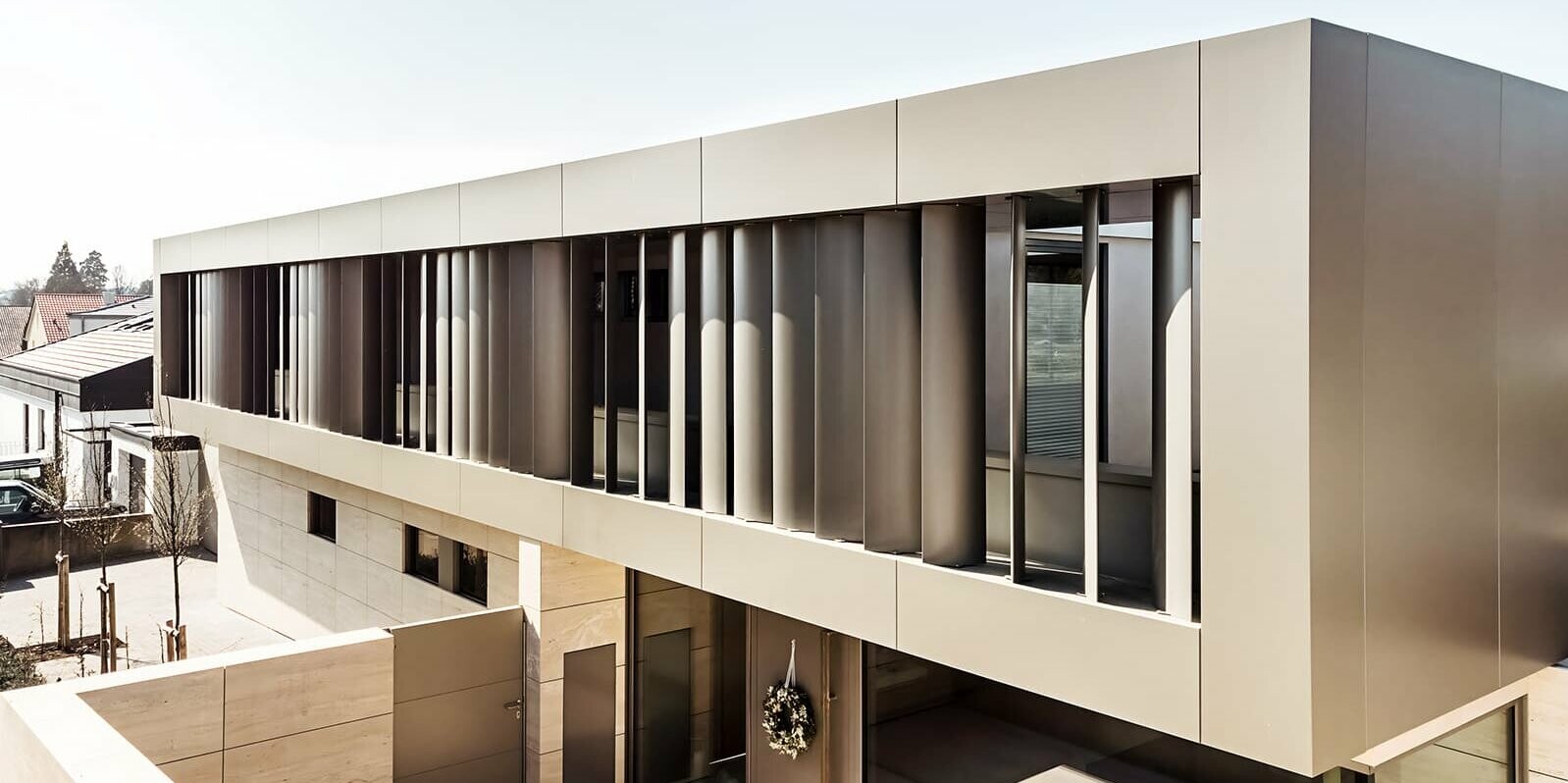 Mot gatan sticker aluminiumfasaden ut en bit över den underliggande stenfasaden och erbjuder därmed ett regnskydd längs byggnaden på den stenlagda entrén. En homogen övergång mellan hus och garage uppnåddes med PREFABOND aluminiumkompositskiva. På byggnadens högra sida fortsätter stenplattans framsida i marknivå för att inhägna gården. Fasaden öppnas upp och luckras upp av lameller som är ordnade i regelbundna grupper som vågor i ett rätblock. Resultatet är organiskt och transparent: Ljuset faller in i byggnaden mellan lamellerna, samtidigt som de erbjuder insynsskydd från gatan. PREFABOND aluminiumkompositskivor fästes osynligt med hjälp av limteknik på en stålunderkonstruktion och en utjämningskonstruktion.