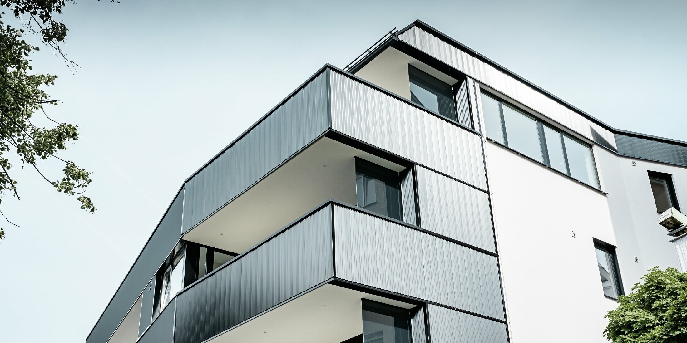 Bland annat balkongerna på detta flerfamiljshus täcktes med PREFA sicksackprofil. Tillsammans med putsfasaden uppstår en modern fasadgestaltning.