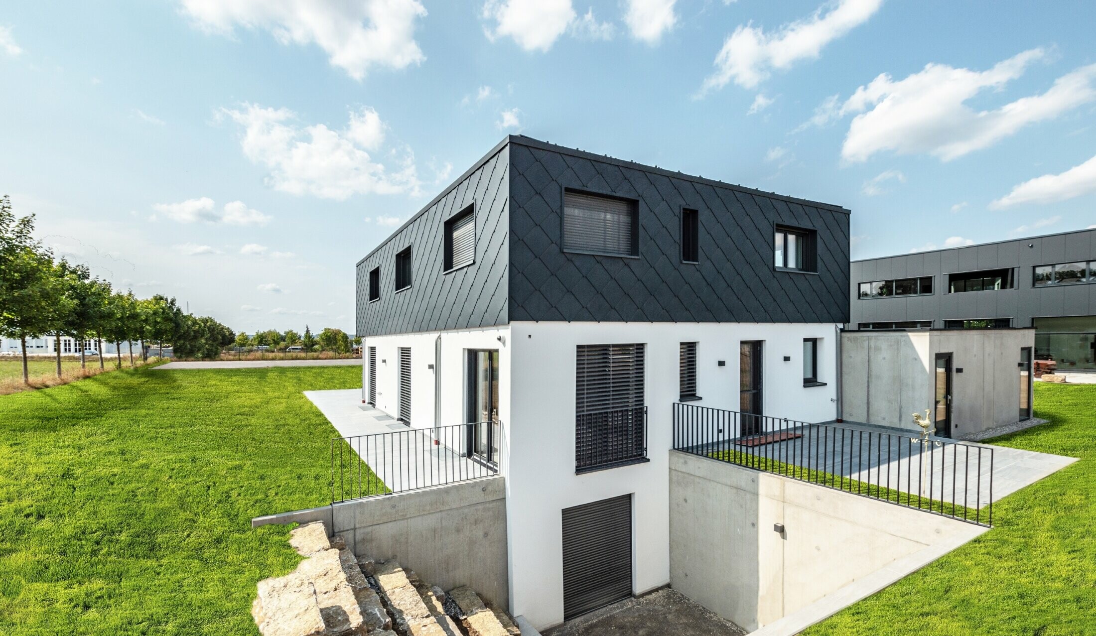 Övre våningen av nybyggnaden kläddes med den stora väggromben 44 × 44 i P.10 antracitgrått.