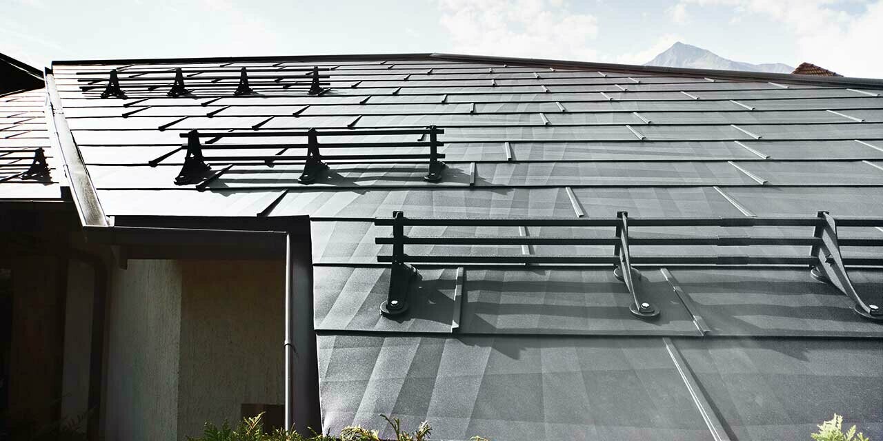 Närbild på PREFA takpanel FX.12 i färgen P.10 stengrå.