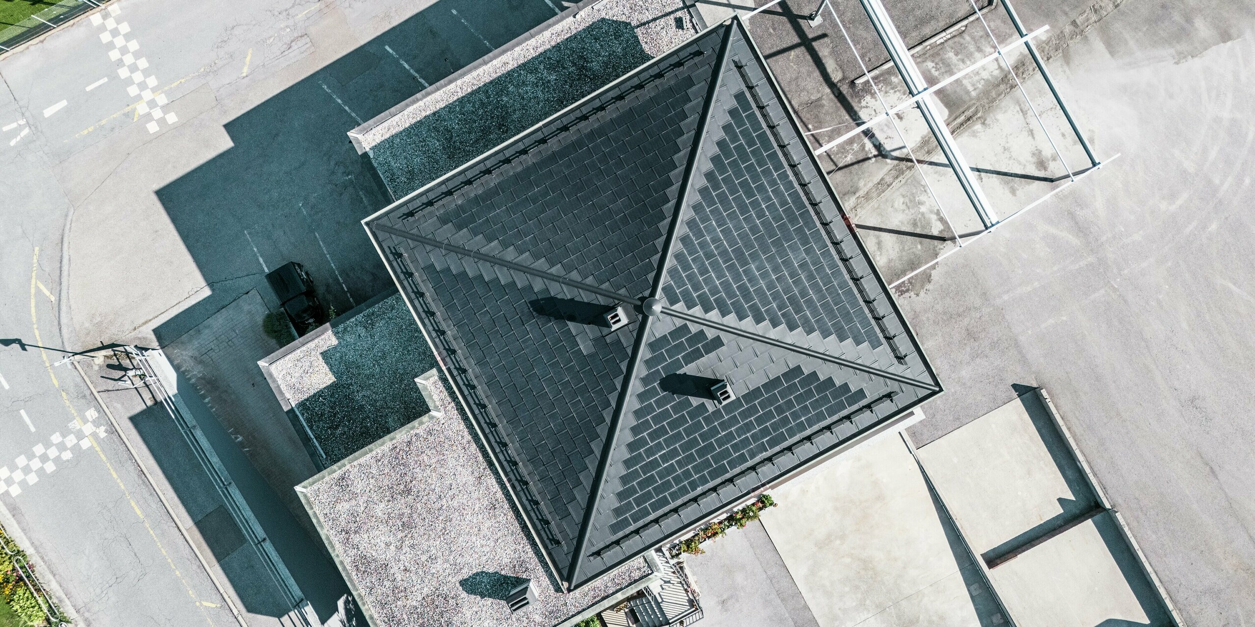 Det markanta tälttaket på vingården Leukersonne i Susten (CH) täcktes med PREFA solar takplattor och den beprövade takplattorna R.16 i P.10 svart. Detta ger ett elegant utseende och garanterar högsta väderbeständighet och hållbarhet. Tack vare den integrerade solartekniken används solen effektivt för hållbar elproduktion utan att kompromissa med takets estetik.